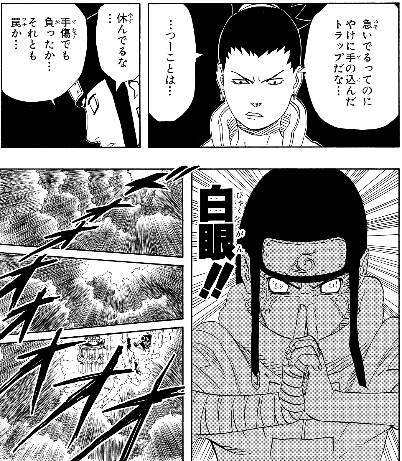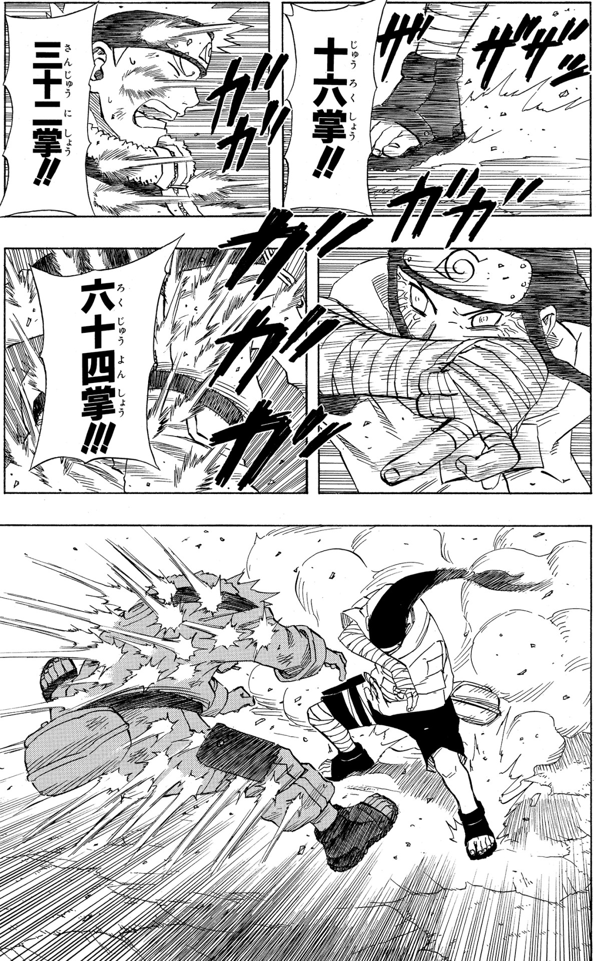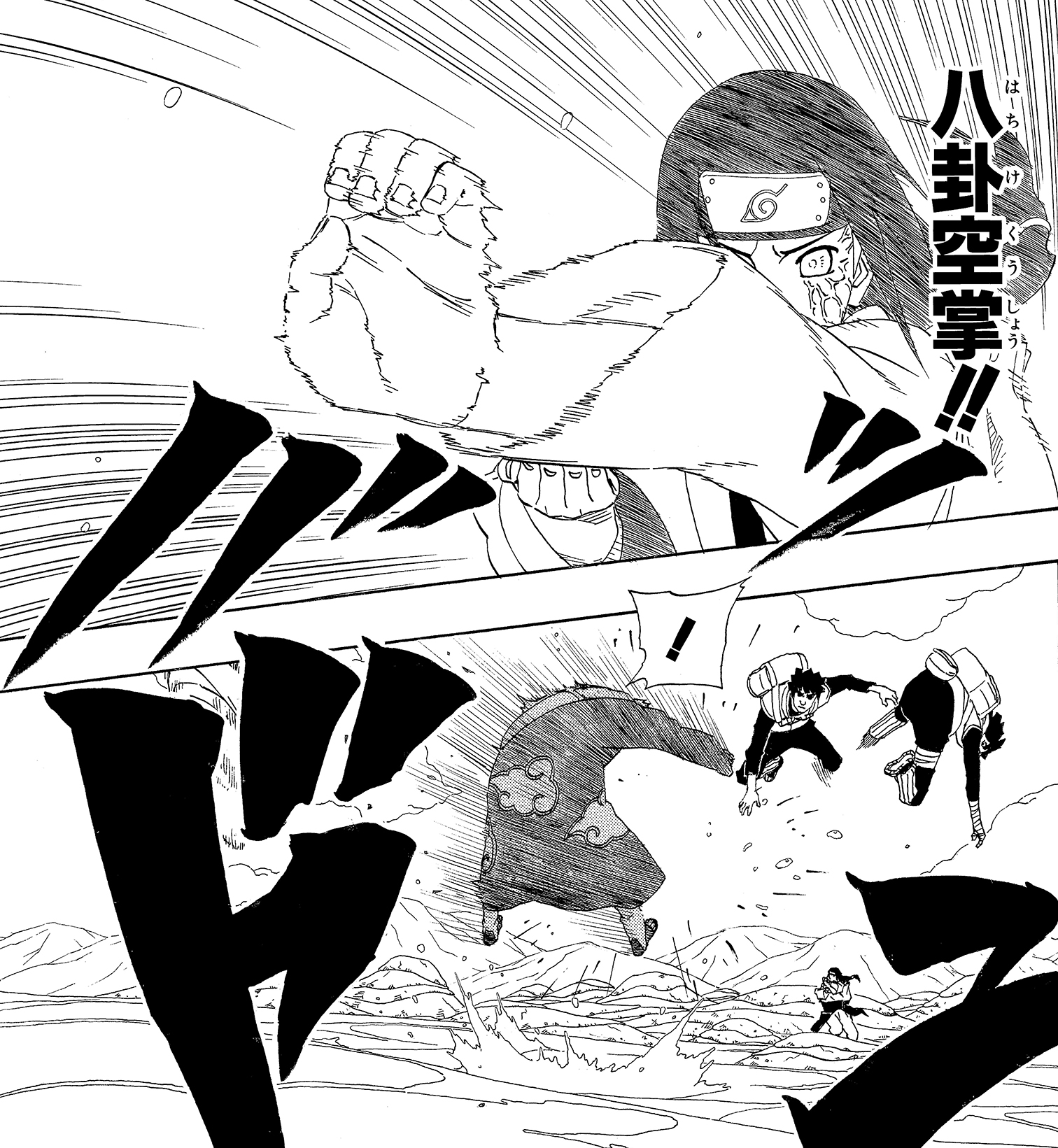 His pessimistic attitude does not stop him from delivering a one-sided drubbing to Naruto, showing off his mastery of the 8 Trigrams Palms Rotation and 8 Trigrams 64 Palms techniques that should normally only be known to members of the Hyuga main branch.