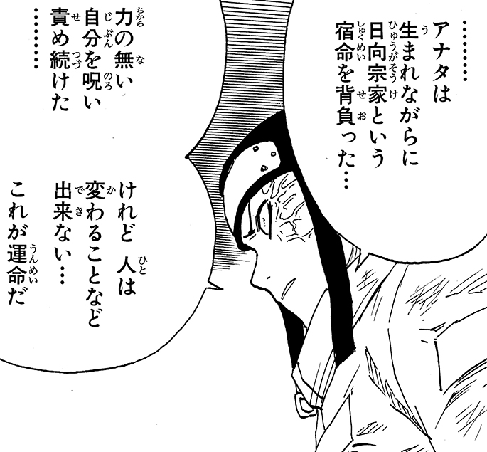 Although people praise his talent, Neji himself rejects the idea of human growth and ability to change due to being imprisoned within the rules governing the Hyuga cadet branch. He believes attempting to alter one's fate is entirely futile.