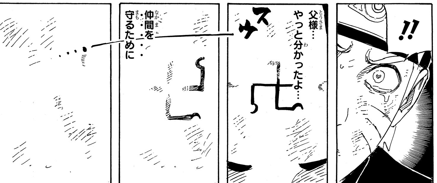 Hearing Hiashi's apology and his father's last words, tears fall from Neji's eyes. He gazes at the sky and speaks to his departed father with a look of contentment.