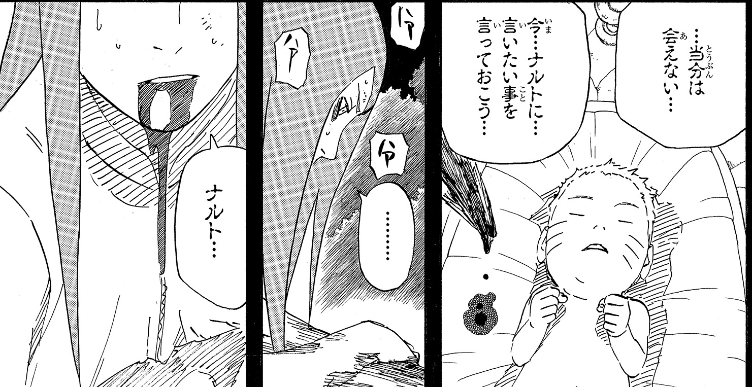 Kushina holds her son tight before resolving to use the little time she has left to protect Naruto and Minato as best she can.