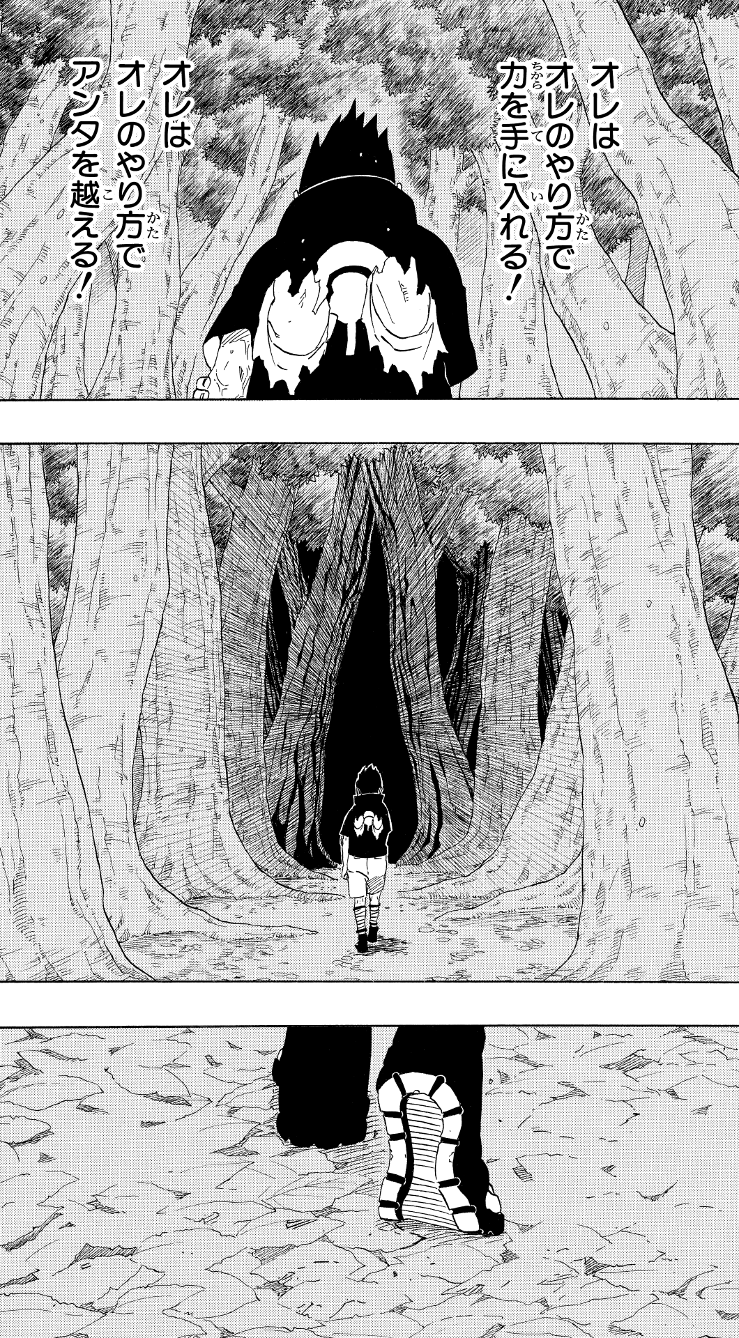 Having been reminded of his life's goal and now keenly aware of his own weakness, Sasuke resolves to seek out Orochimaru to attain the power he needs for his revenge.