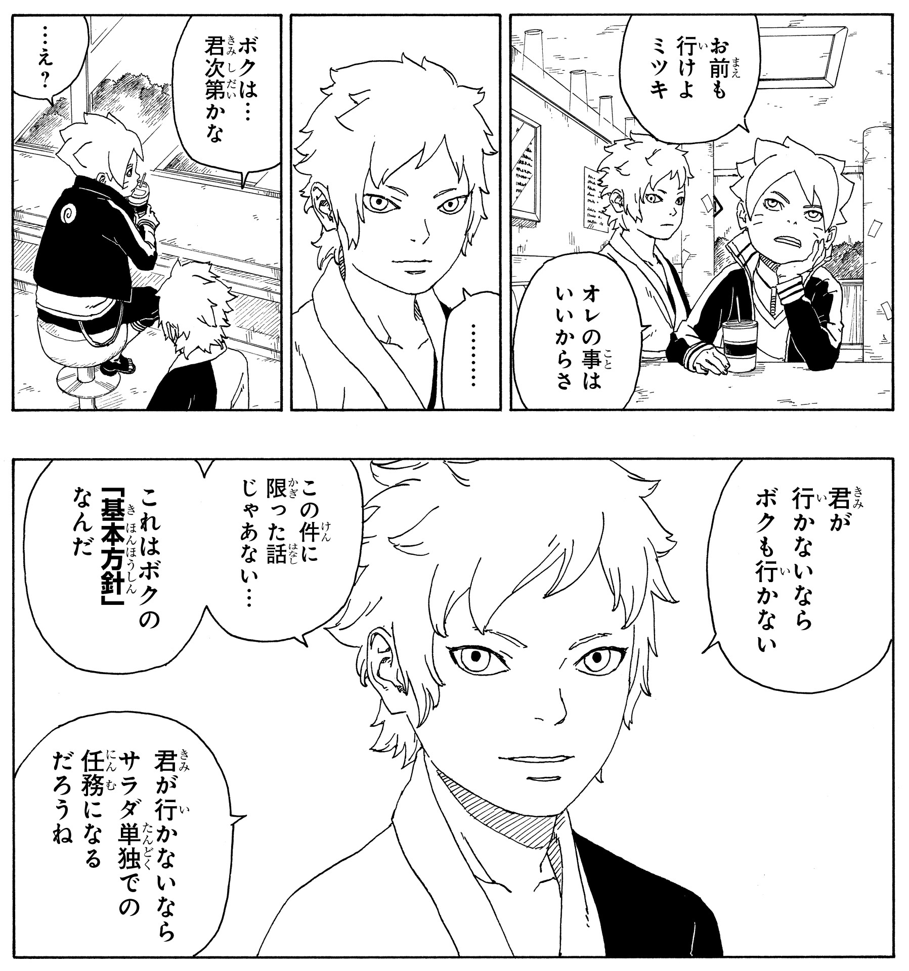 For example, when Boruto objects to taking a mission related to a scientific ninja tool and tells his teammates to go without him, Mitsuki refuses without hesitation despite it being an assignment directly from the Hokage.