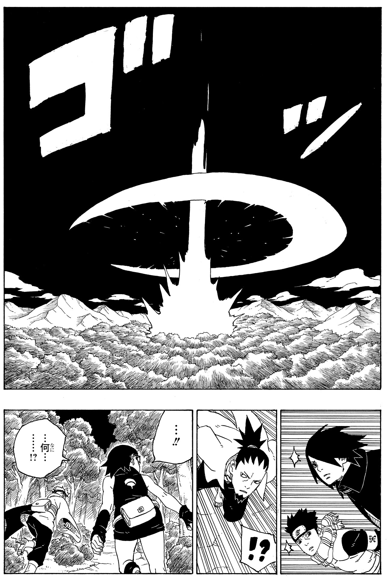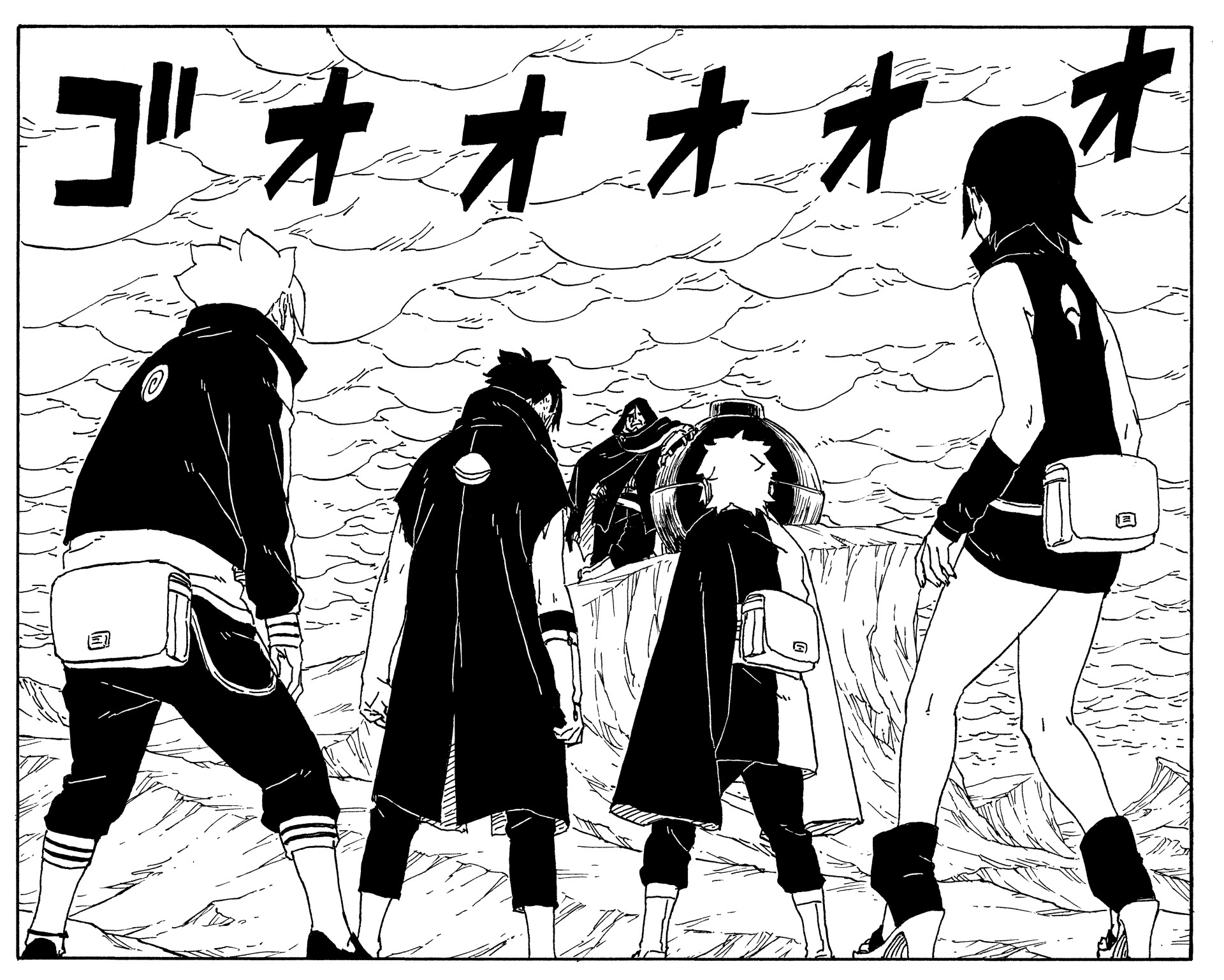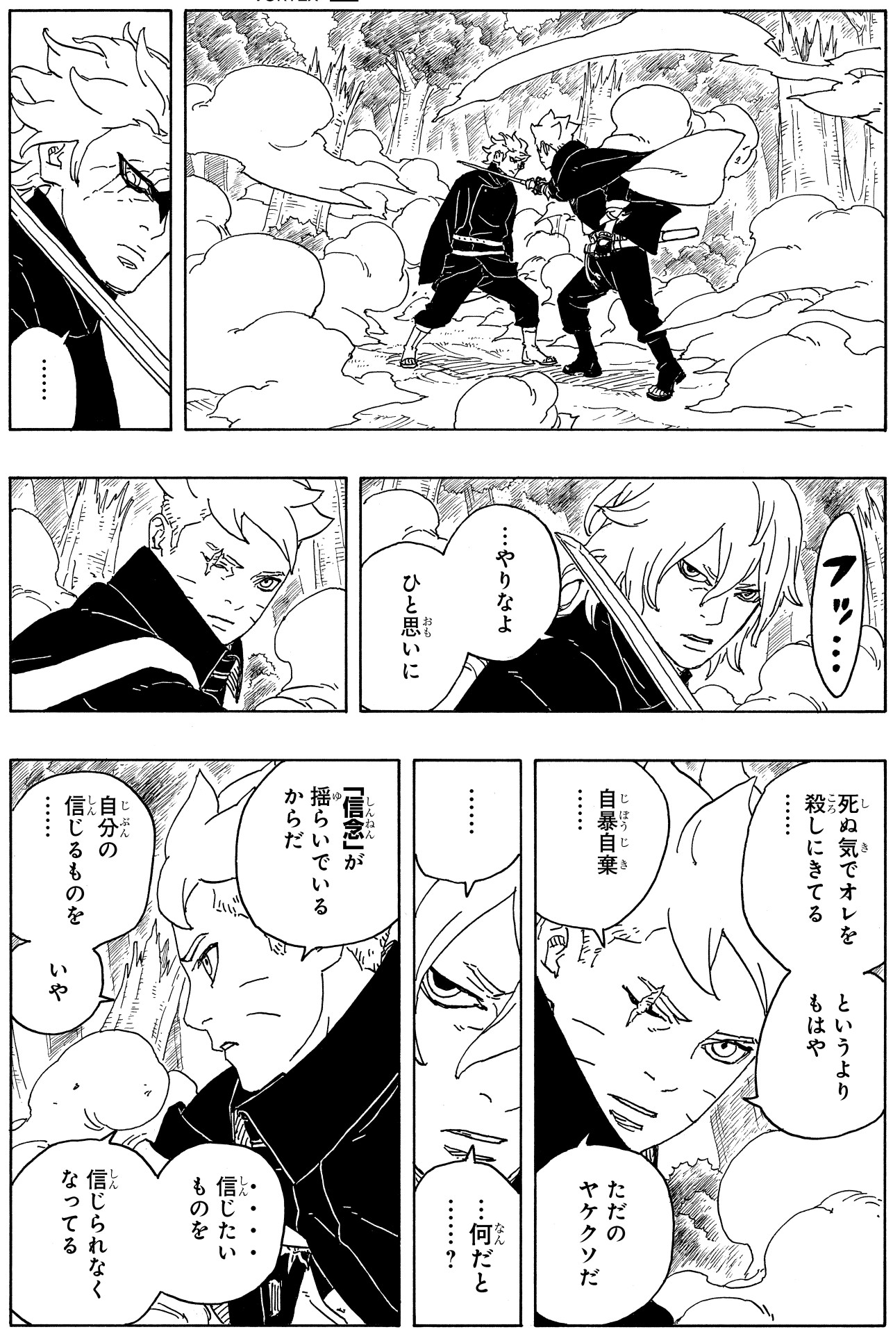 Kawaki and Boruto respond to Boro's provocations and rush in, but find themselves incapacitated by a strange, dark mist. It falls to Mitsuki to rescue them.
