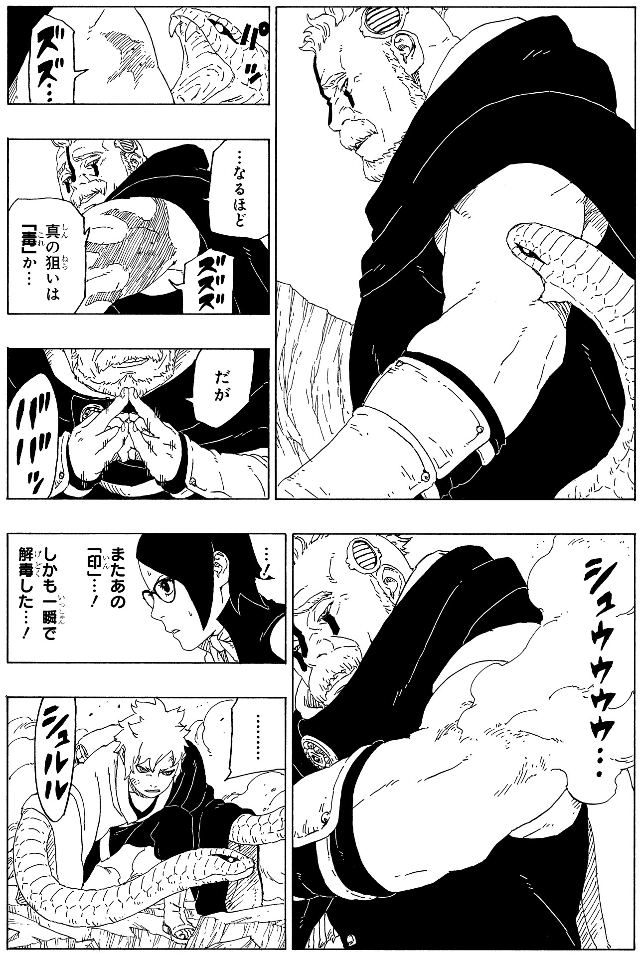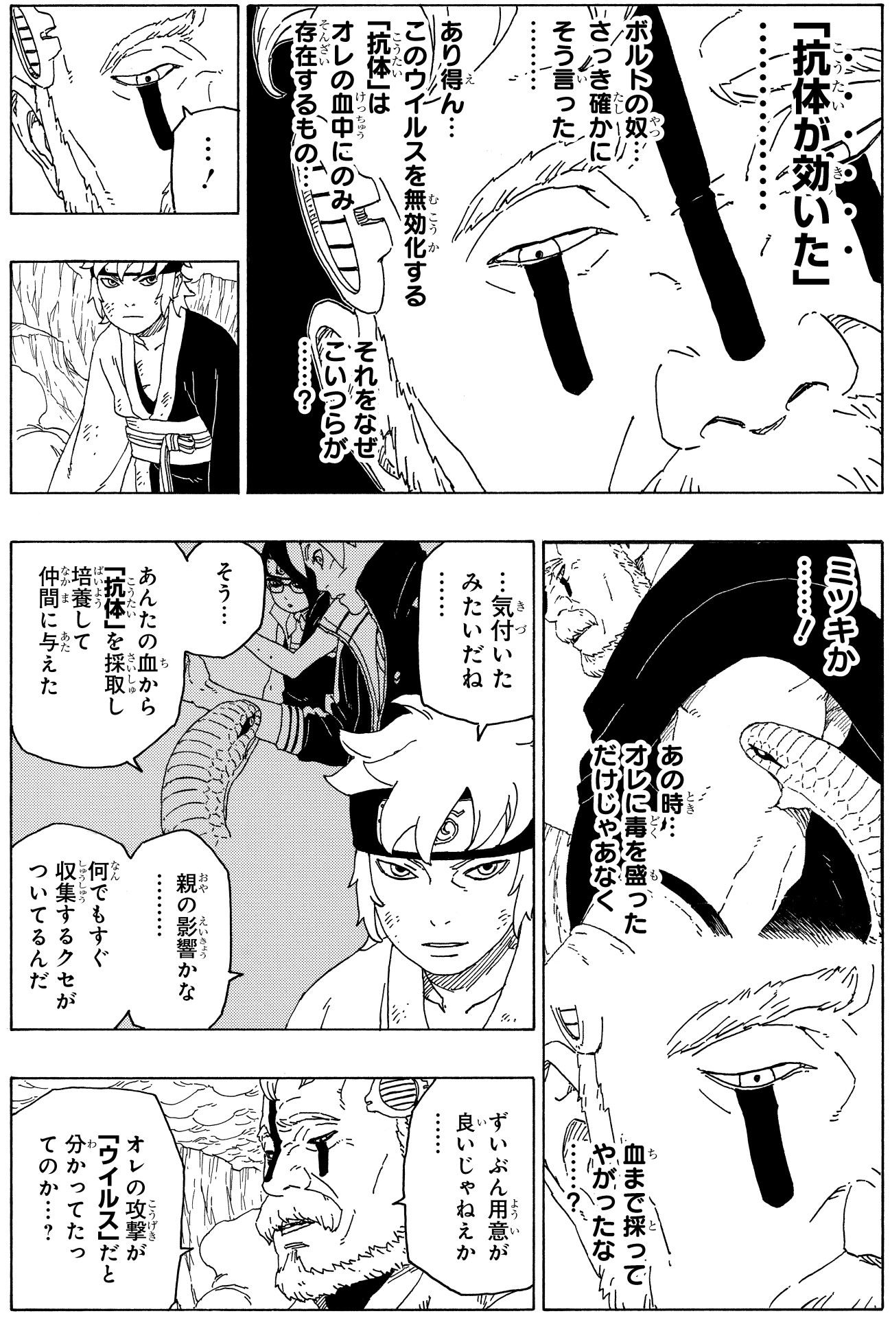In addition, Mitsuki's snake collected some of Boro's blood and the antibodies within it! He is able to pass these on to his teammates, nullifying the viruses' effects and allowing them to corner Boro!