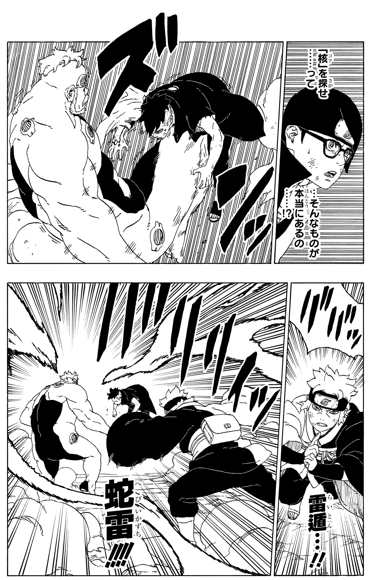 The three boys fight desperately to hold Boro off while Sarada searches for the core with her Sharingan and finally destroys it using Chidori!