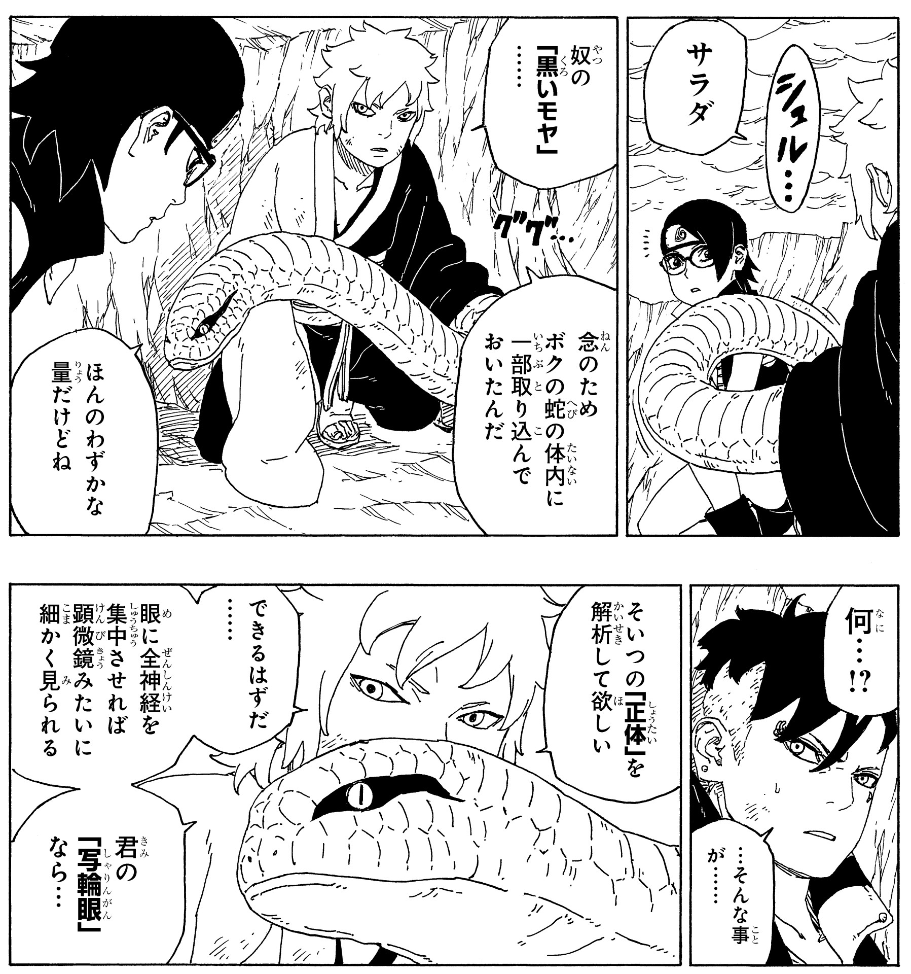 Mitsuki uses a snake to collect some of the mysterious mist, which Sarada is able to analyze using her Sharingan. As a result, the team discovers that Boro's mist is made of viruses!