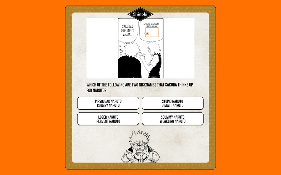 Q. Which of the following are two nicknames that Sakura thinks up for Naruto?