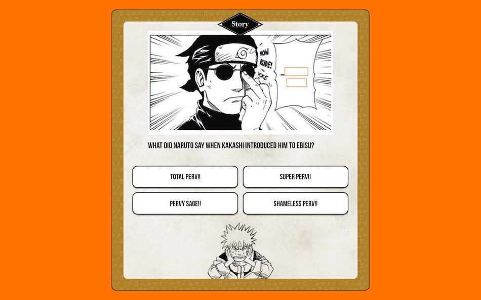 This was a question from Volume 10! It’s when Kakashi recommended Ebisu for Naruto’s teacher!