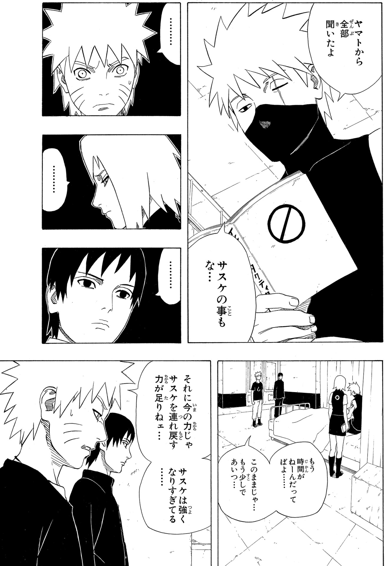 While Kakashi is recovering, the rest of the team manages to find Sasuke but is unable to bring him back.