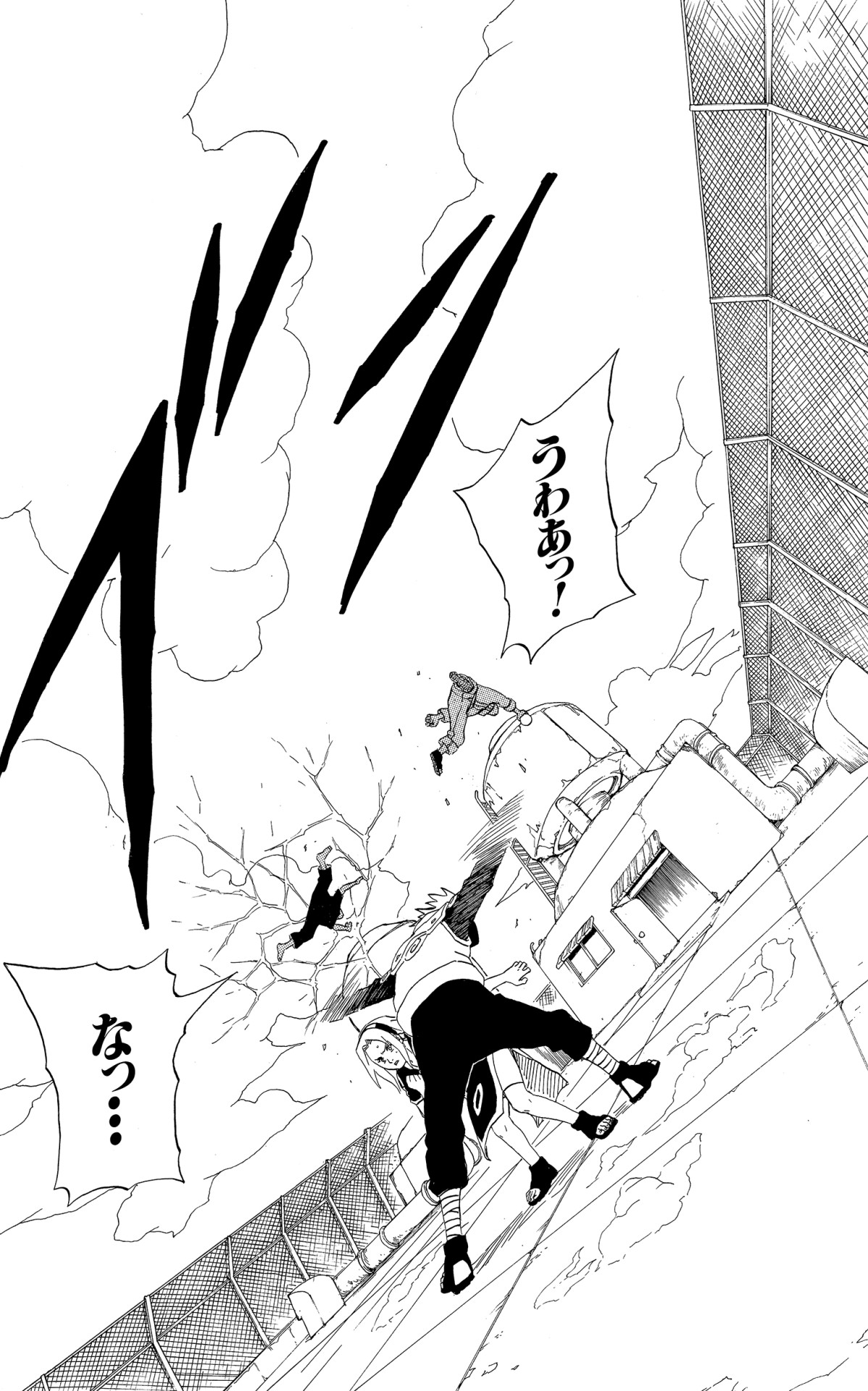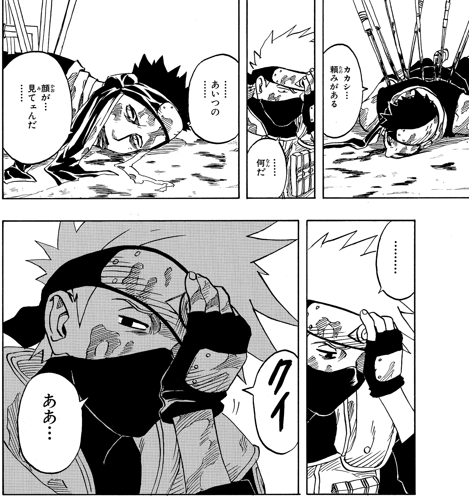 —Kakashi intervenes, and the situation is safely resolved. However, Kakashi is ill at ease that the two boys' rivalry has escalated to the point that they're using moves with the potential to kill against each other.