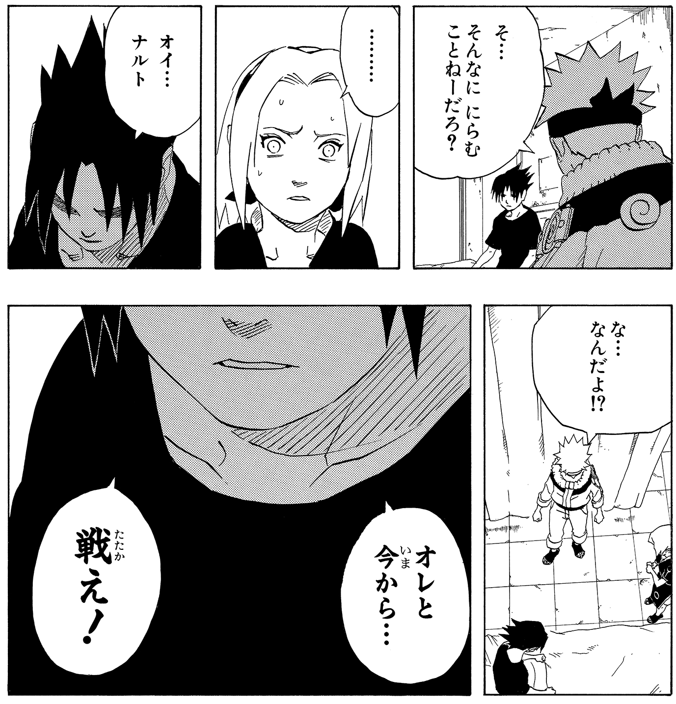 Sasuke runs off to find his brother and engages him in combat, but is forced to realize that the gap in strength between them is still painfully vast. Afterwards, despite having barely recovered from his injuries, he challenges Naruto to a fight while wearing a murderous expression.