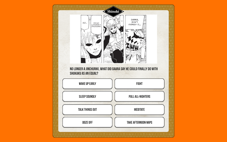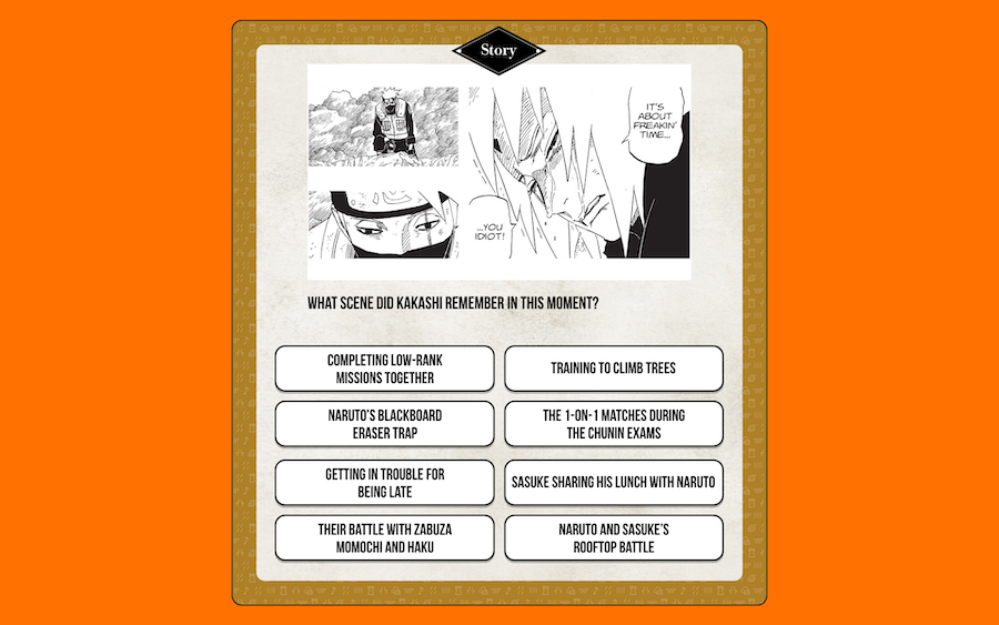 Take a walk through Naruto’s journey, and we hope you continue to enjoy the Shinobi World Quiz NARUTO MANIA!