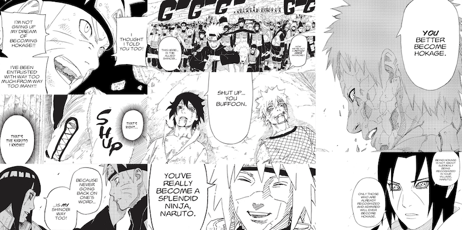 Sakura and Kakashi found Naruto and Sasuke lying next to each other after their battle had come to an end. This is where Kakashi watches over the reunited Team Seven.