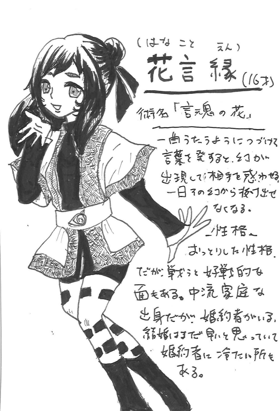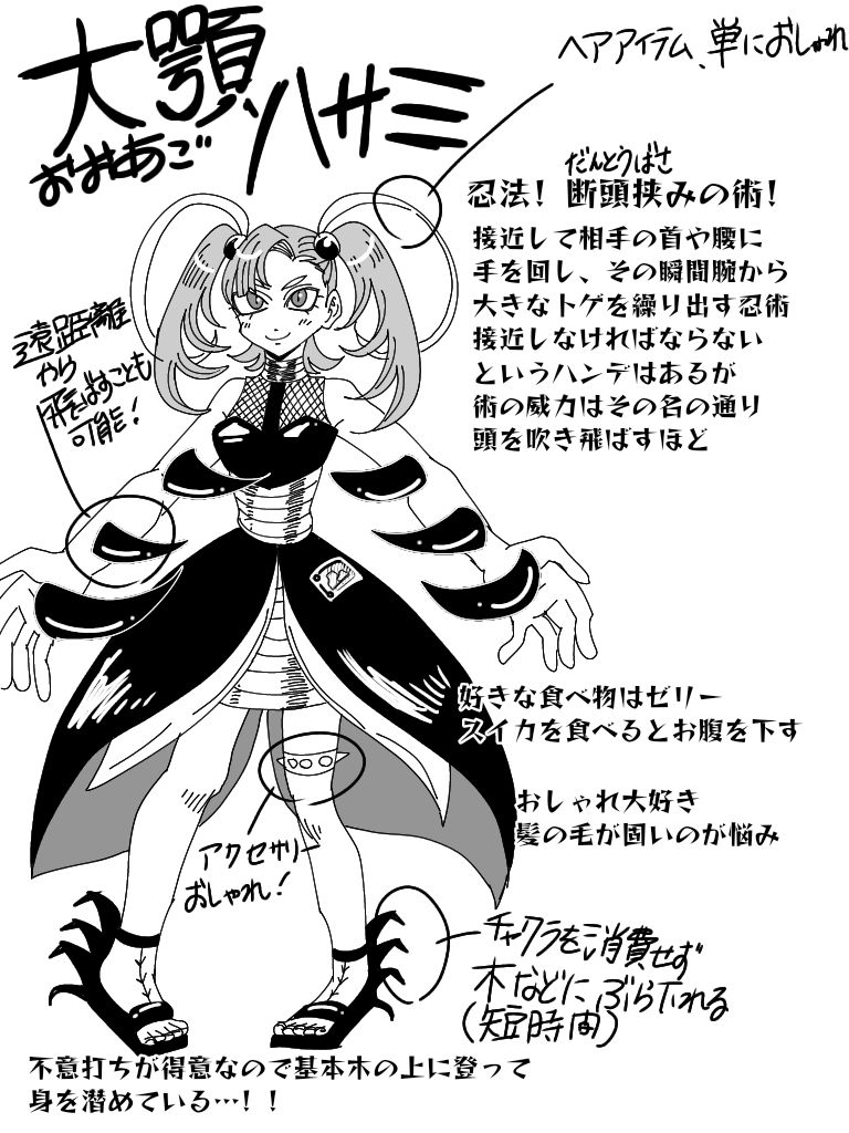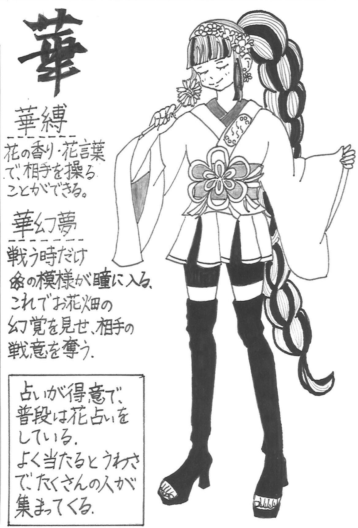 The character design and setting are both fantastic. I especially like the bold contrast around her waist. The jutsu names are also quite creative and well thought-out. It seems like she's in a relationship, but I wonder if the two are in a truly equal relationship. The more I think about her powers, the scarier they become.