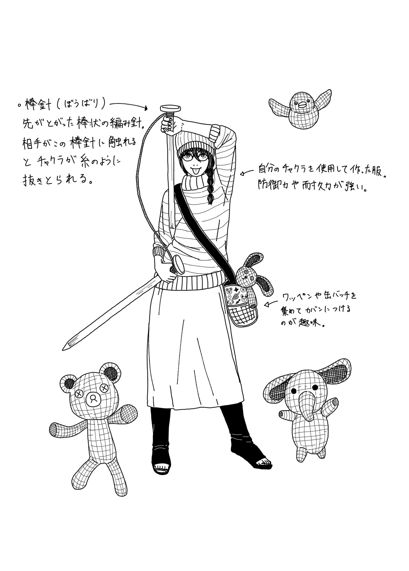 A shinobi who loves knitting and cute things. Specializes in missions that require pursuing or tailing a target. Fights with two oversized knitting needles and uses them to knit together her and her opponent's chakra to weave things into existence.