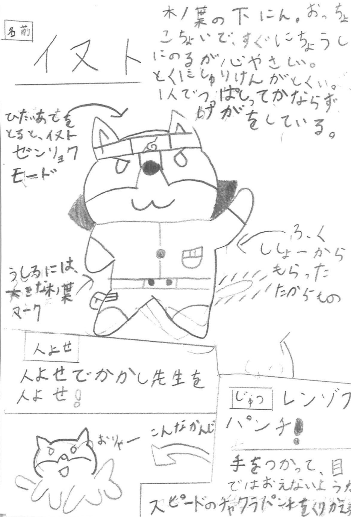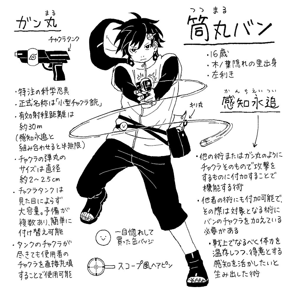 Has a hobby of naming his personal items (with a tendency to derive names from his own), so each of his kunai has its own name. Some may find his resting face somewhat scary, but he's cute when he smiles. He likes round things.