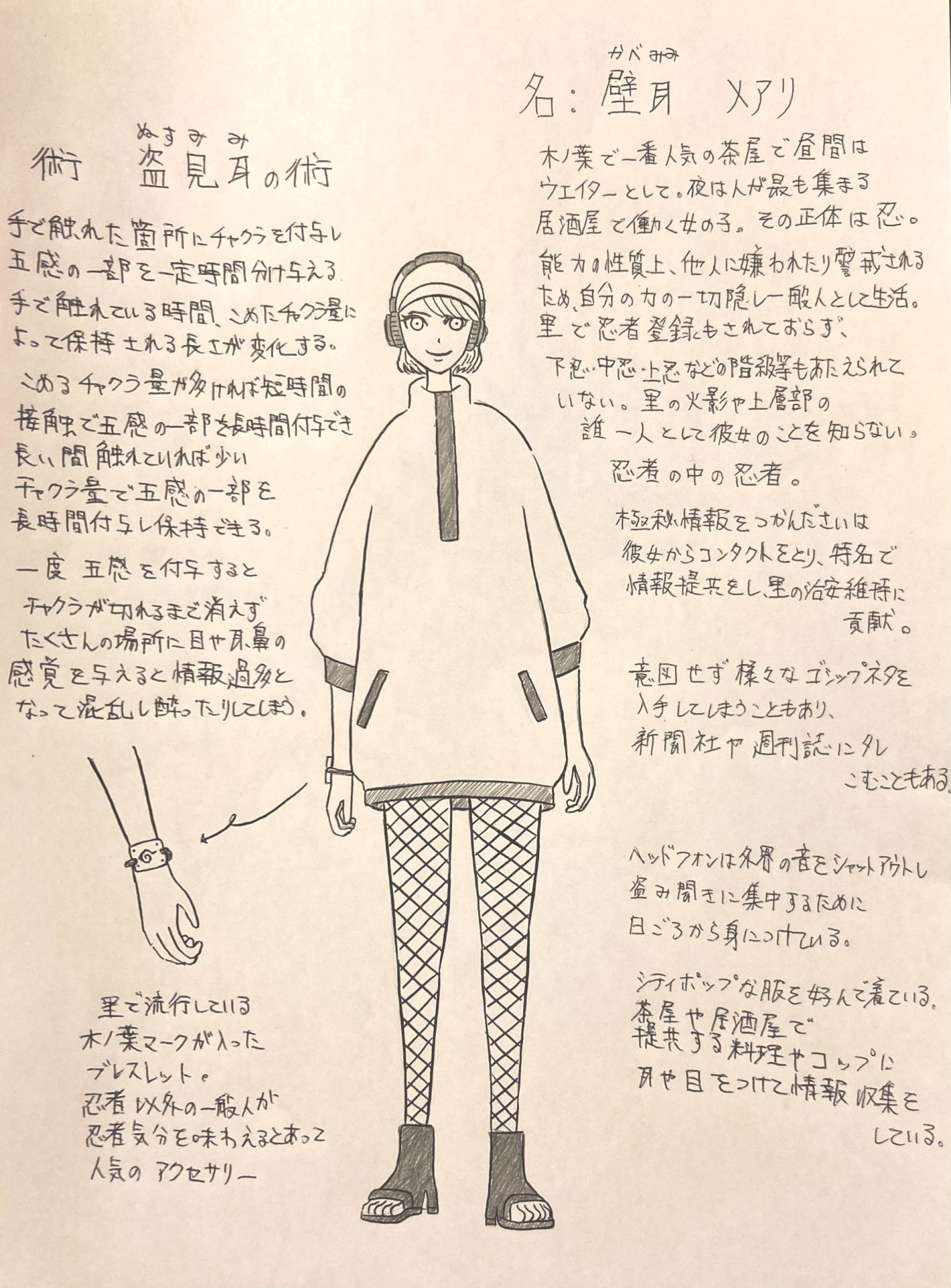 This character is able to infuse her chakra into walls and small objects and link them to her senses of sight and hearing in order to gather information, right? This is a super interesting power, but in the Hidden Leaf Village, using these powers without being affiliated with an organization could get her in some serious trouble. Sensory type shinobi could easily find out about her and bring her in for questioning. How would she get out of this predicament? Would she simply fall in line and join an organization, or would she flee the village and go down a darker path? I think what happens in her future would be really interesting.