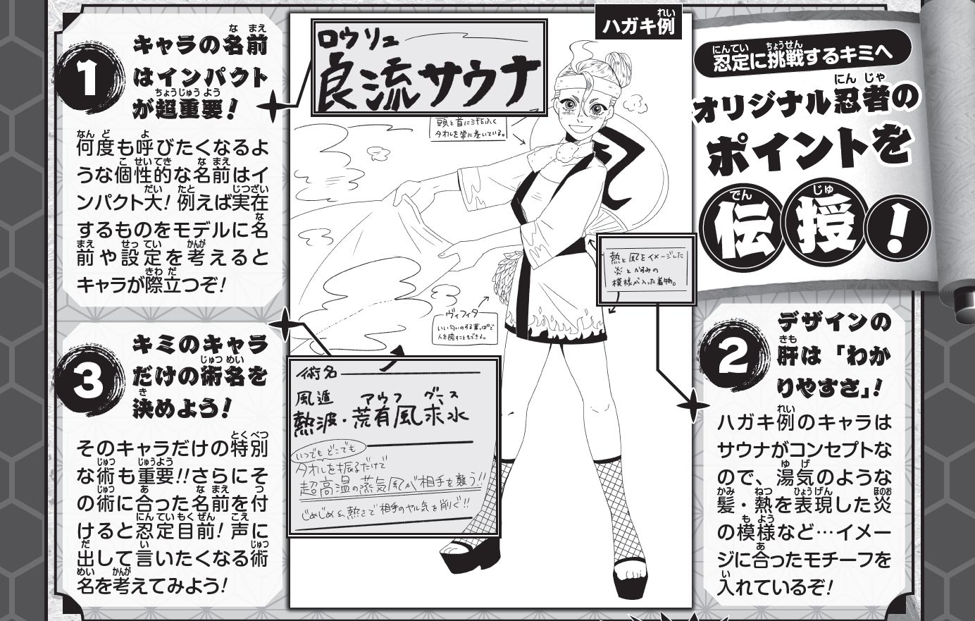 Please draw your original ninja in black and white on the back of a postcard, along with the names of your character and their jutsu. On the front please write your postal code, address, name (please include your real name as well if using a pen name), age, phone number, and the name you'd like written on the prize art board if you win.