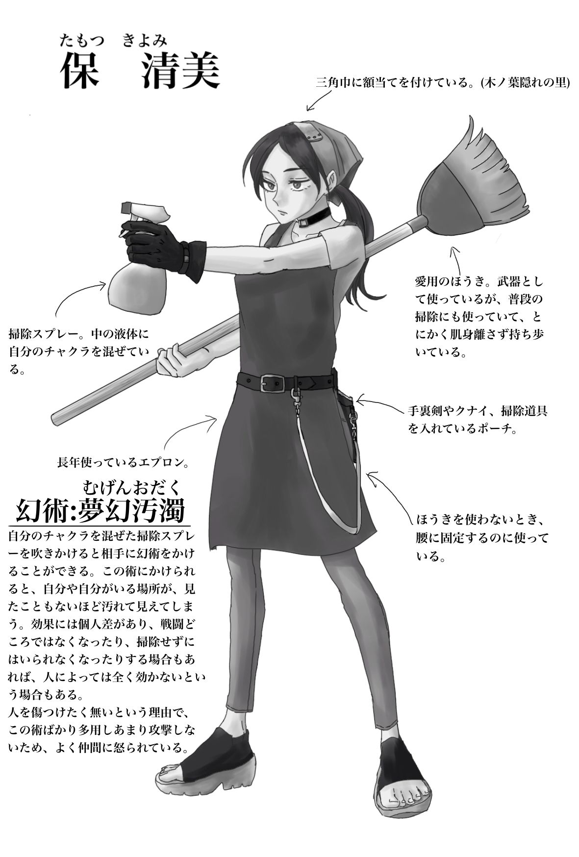 She's a shinobi who is kind to a fault, choosing to show her enemies a world covered in filth rather than engage them in direct combat... However, I'm wondering if she puts her cleaning tools in the same pouch as her shuriken and kunai. I can't stop thinking about whether she has a way to keep them separate or just has them all jumbled up in there. Please understand, this isn't me giving a critique or anything, I'm just honestly curious.