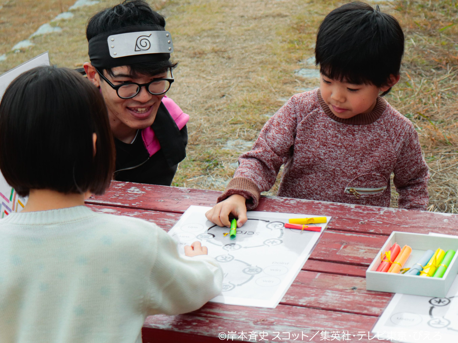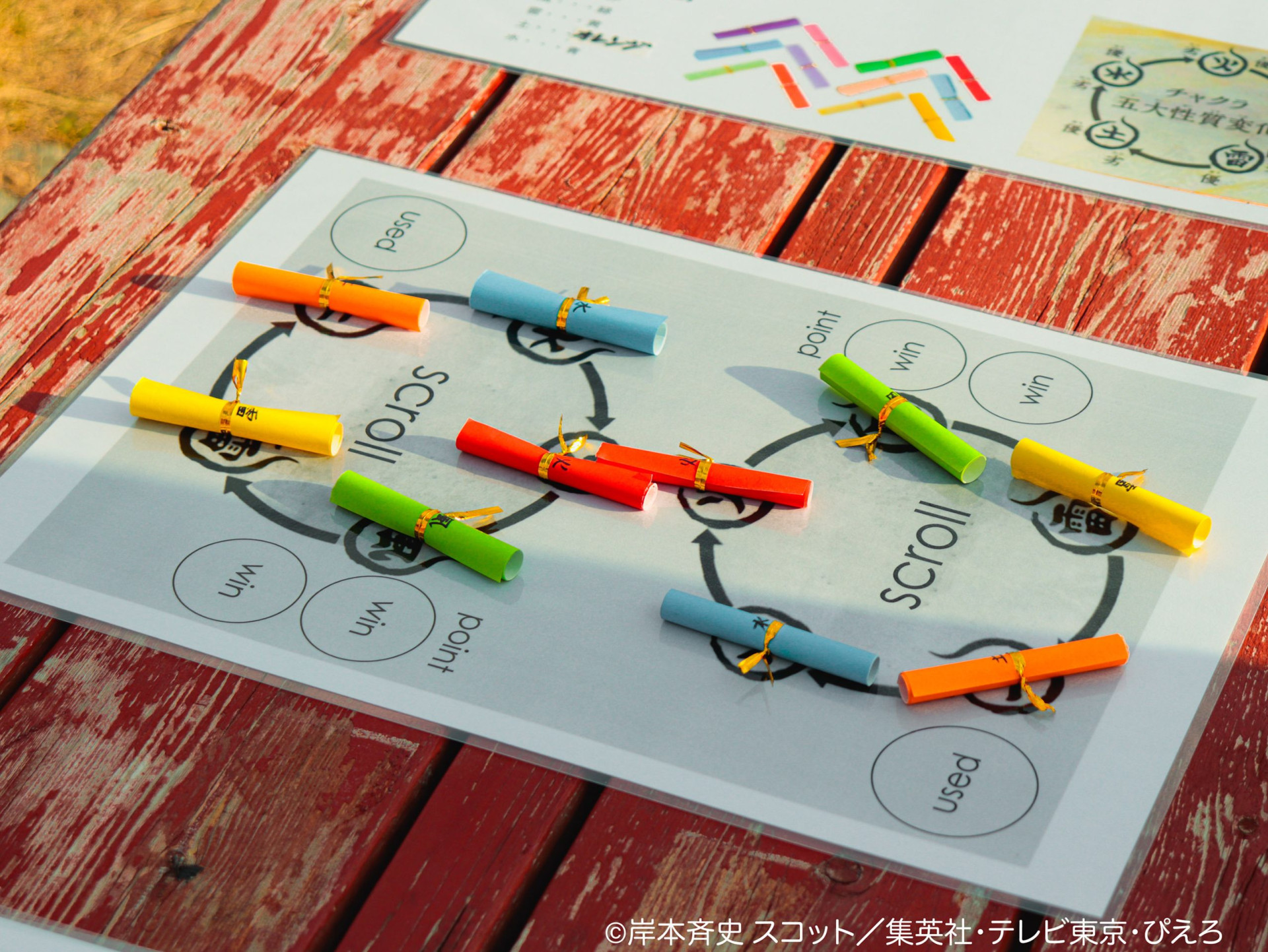 Details: Players receive 5 scrolls, one of each chakra nature (fire, water, earth, lightning, and wind). They unleash a jutsu by saying its name out loud. Players play multiple rounds, and the advantageous chakra nature wins each battle.