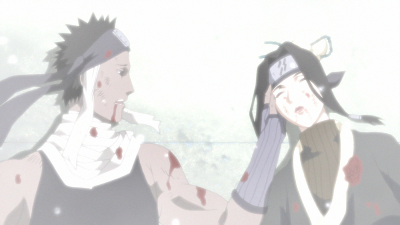 El sol comienza a ponerse cuando cae la noche, pero los dos shinobi continúan golpeándose entre sí.