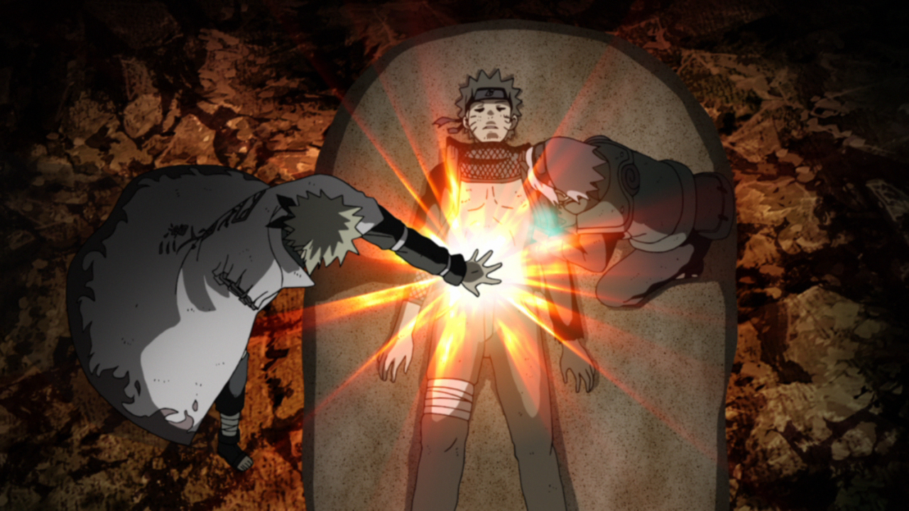 Gaara y Sakura se apresuran a llevar a Naruto a Minato y Kakashi, con la esperanza de salvar la vida de su amigo transfiriendo la mitad del chakra del Nueve Colas que aún reside en el Cuarto Hokage a su hijo.