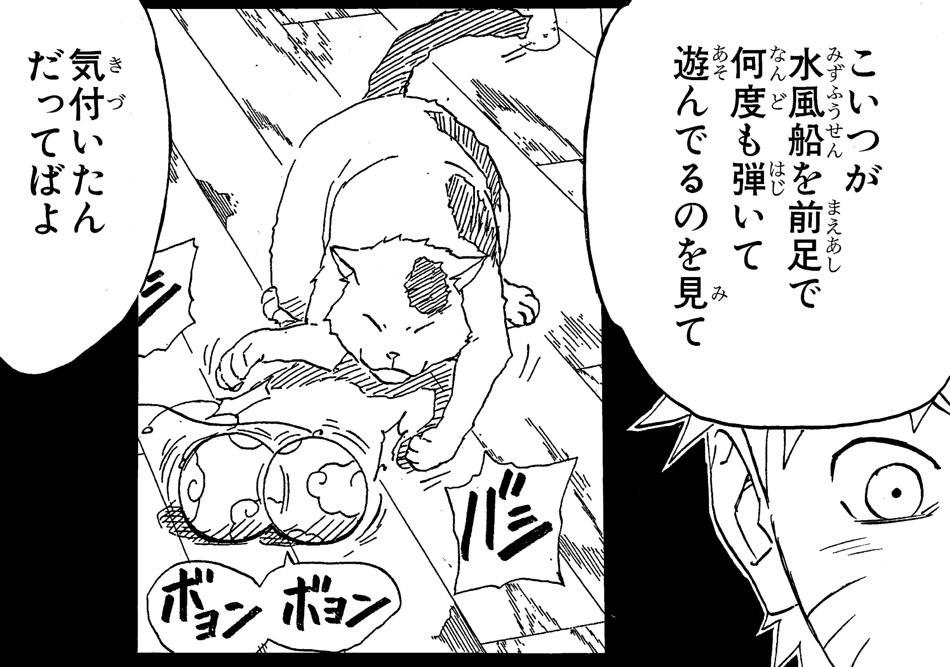 El gato empujaba muchas veces con su pata derecha en el globo de agua que sujetaba con la pata izquierda, lo que hacía girar el agua de dentro en varias direcciones, provocando una especie de “giro desbocado”.