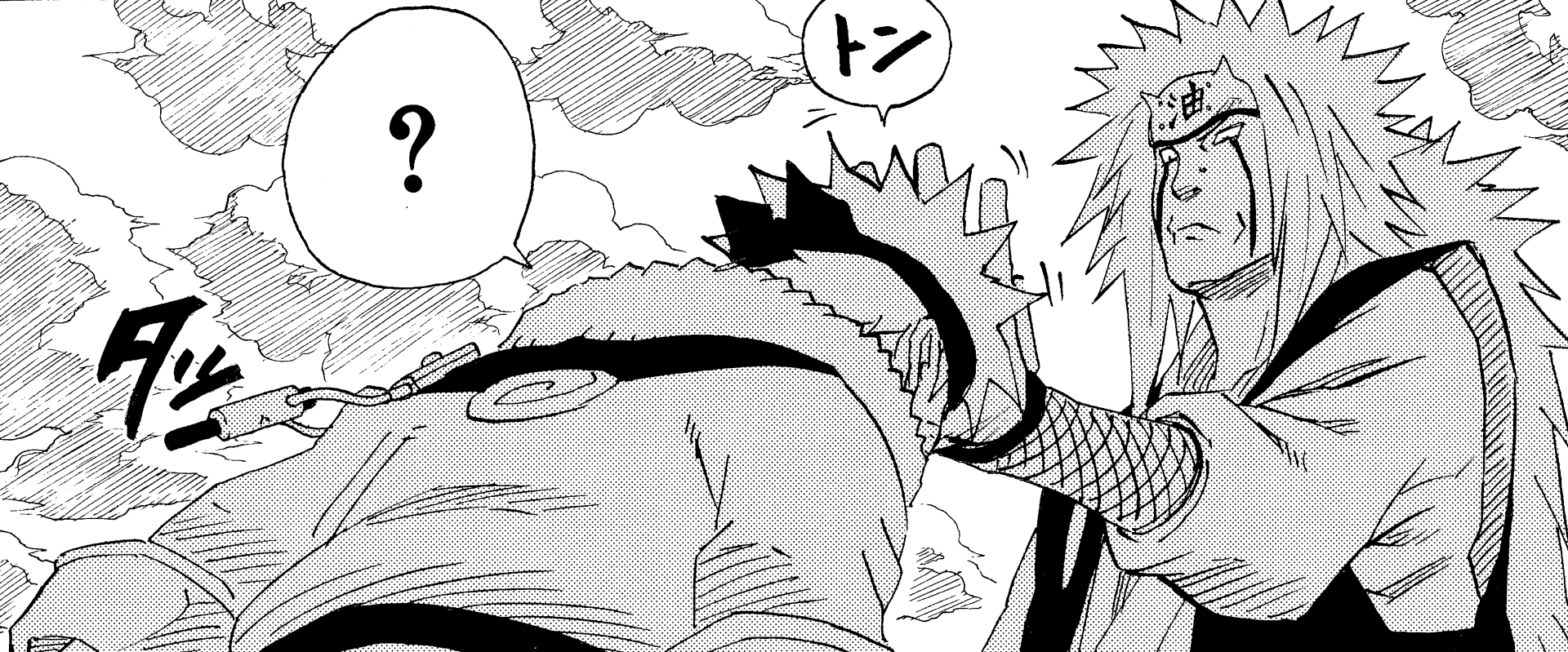 Jiraiya, harto de ver que no progresa, le da un consejo a Naruto después de comprobar la dirección del remolino de su cabello.