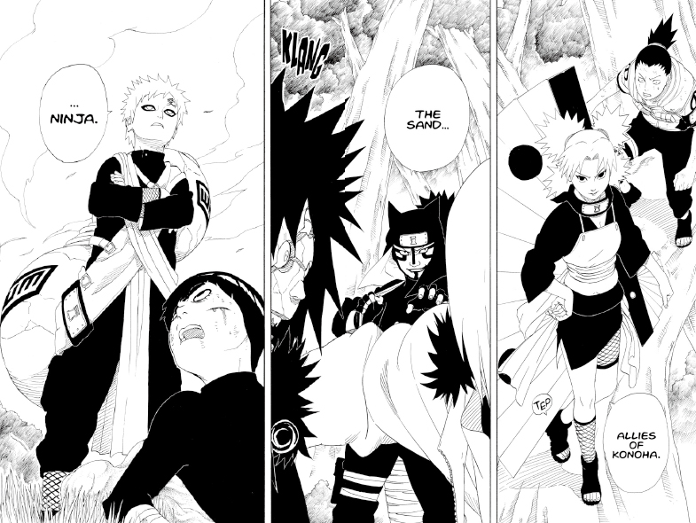 Sinceramente, la gran variedad de usos de la arena es increíble. También es genial el desarrollo de Gaara, que al principio aparece como un enemigo, pero luego se convierte en un compañero. La escena en la que, tras la destrucción de la Villa oculta de la Hoja, Lee, Kiba y Shikamaru persiguen a Sasuke, luchan contra varios enemigos y aparecen Gaara y sus hermanos, es tan impresionante que se te salen las lágrimas.