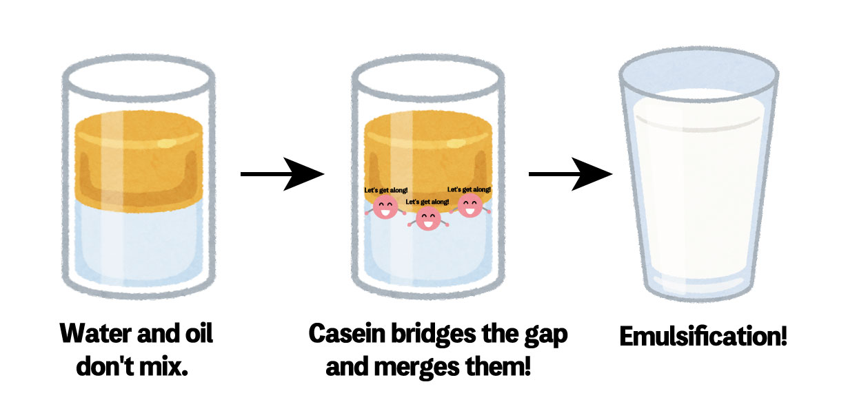 La leche se forma a partir de la emulsión (mezcla) de dos componentes que regularmente se repelen entre sí: el agua y el aceite. Lo que actúa como emulgente para unir a esos dos elementos es la caseína, una proteína que se encuentra en la leche.
