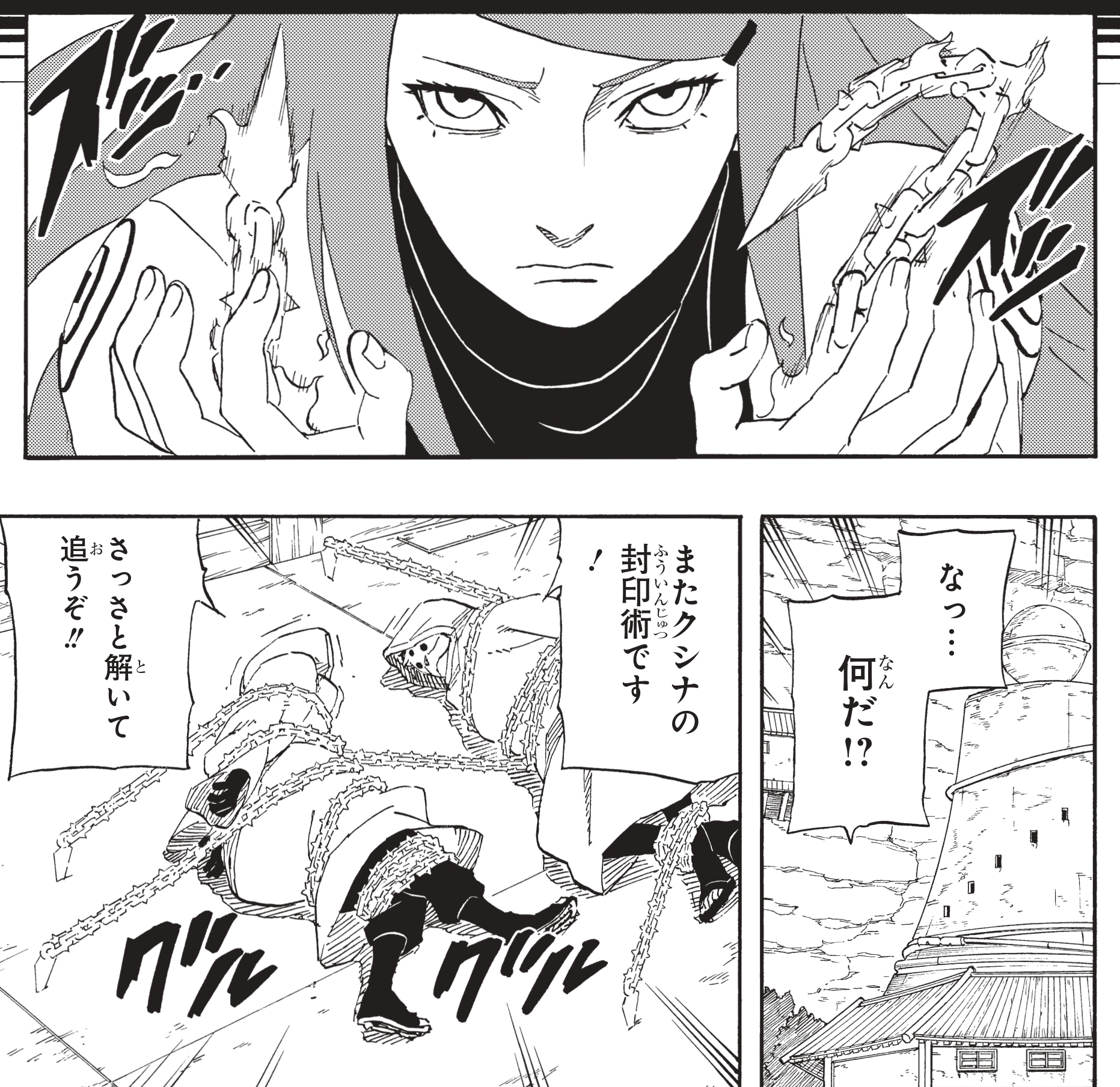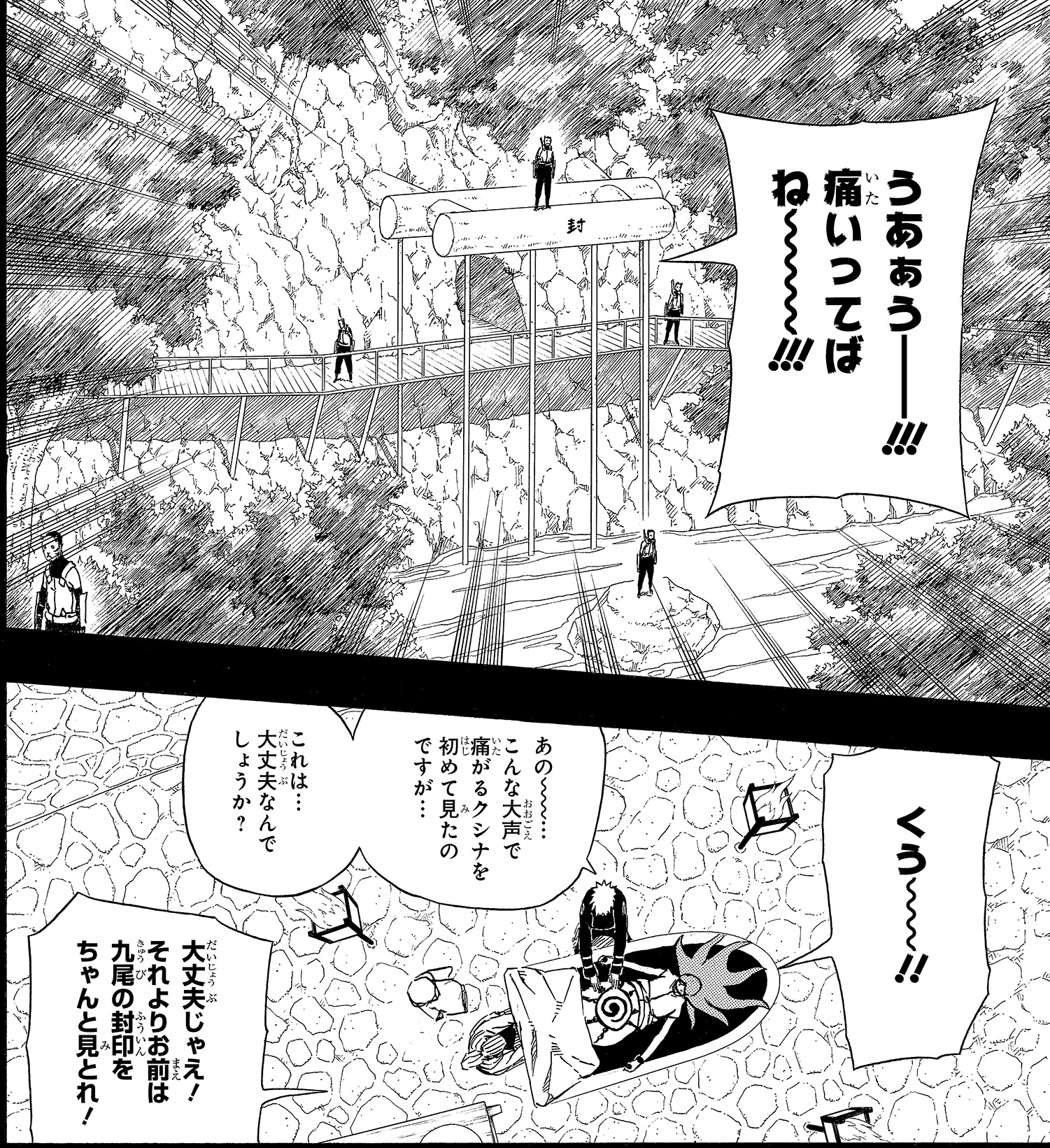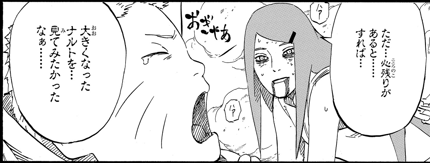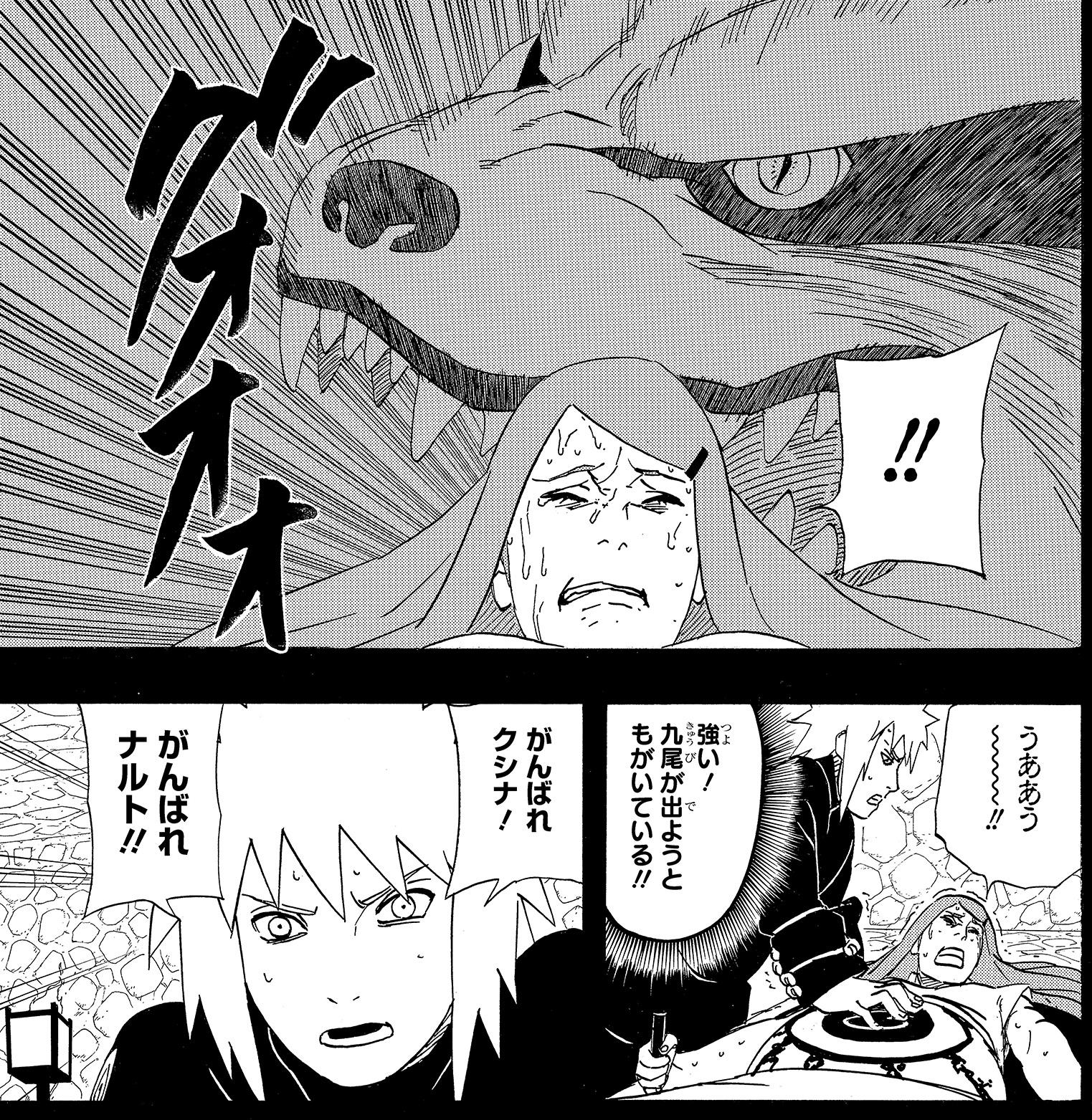 Poco después de entrar en la barrera, Kushina comienza a sentir el dolor de las contracciones. A medida que el sello se debilita, el Kyūbi comienza a manifestarse.