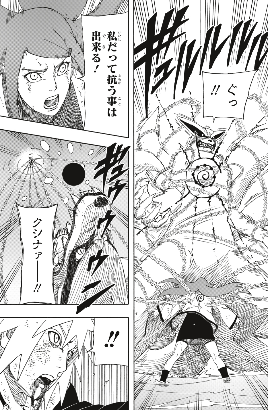 Kushina comienza a perder el control del Kyūbi dentro de su cuerpo y se convierte en una bestia con cola.