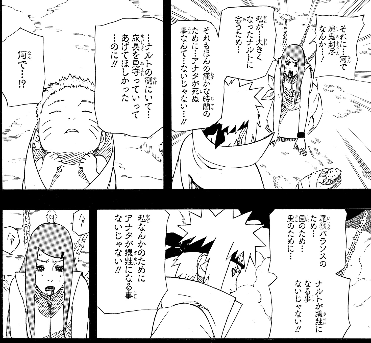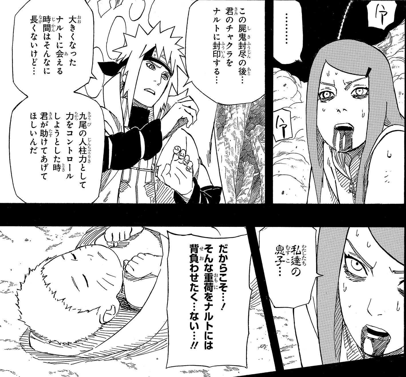 Sin embargo, Minato detiene a Kushina, y hace uso de la técnica de “Sello del demonio mortal", poniendo en riesgo su vida.