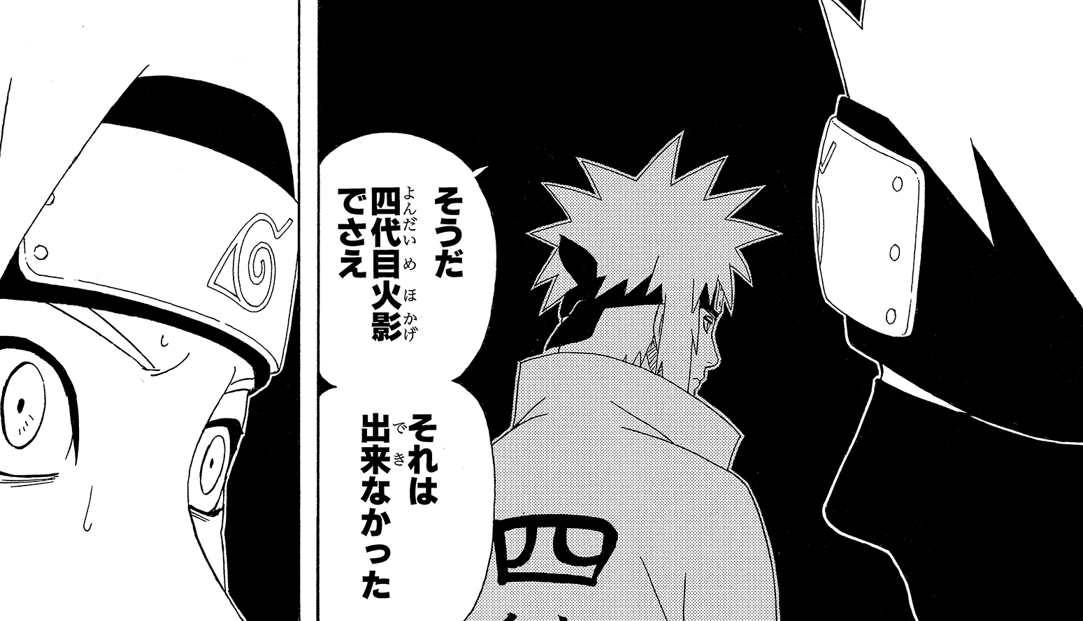 Kakashi apoya con toda su fuerza a un Naruto que busca desafiar un área a la que incluso el autor de dicha técnica, el Cuarto Hokage, no logró llegar.