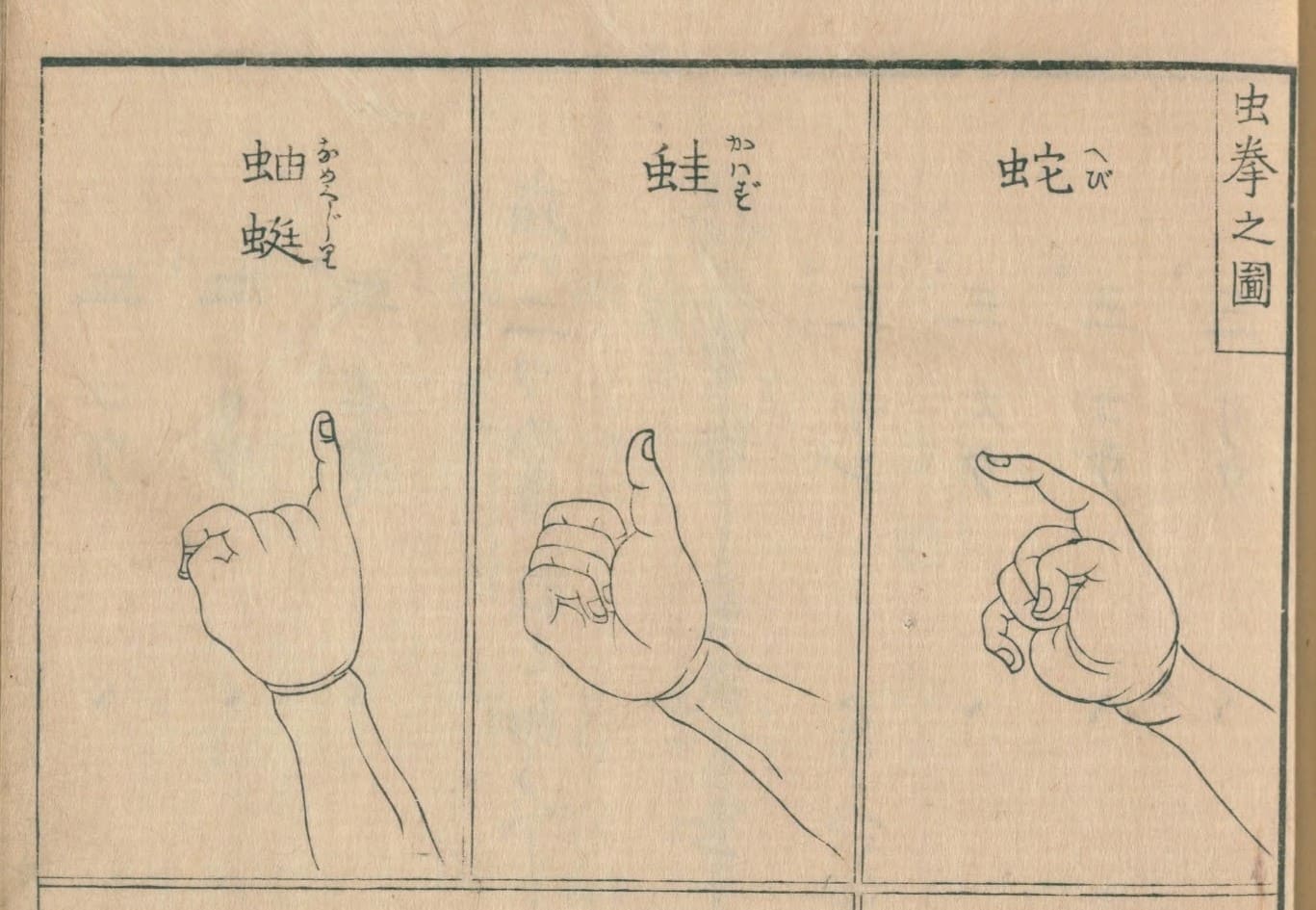 La primera vez que aparece la expresión “combate a tres bandas” (N. del T.: la expresión en japonés, sansukumi, tiene la connotación de un enfrentamiento entre tres que llega a un punto muerto), es en los clásicos chinos. En el término de rana de la “Colección clasificada basada en los clásicos y otra literatura”, una enciclopedia de la dinastía china Song (960-1122), se dice: “Un sapo, un ciempiés y una serpiente no se mueven”, y en el de serpiente: “Una pequeña serpiente es devorada por un ciempiés”. También está escrito en el “Compendio de Materia Médica” de China, conocido en el Japón de esa época.