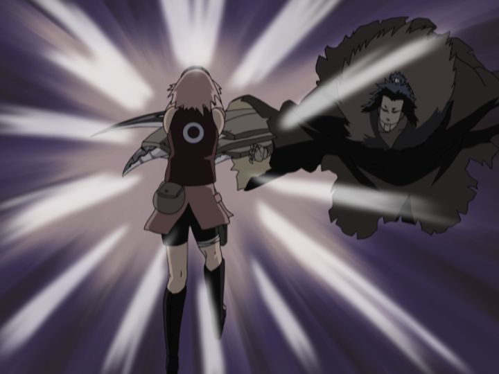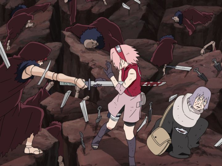 Avec les 100 marionnettes de Sasori face aux 10 de Granny Chiyo, et Sakura poursuivant le marionnettiste lui-même, le combat se transforme en un chaos qui rappelle une guerre à grande échelle.