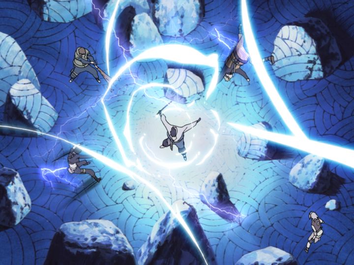 L'équipe de quatre hommes travaille ensemble pour capturer Sasuke, mais ses capacités ont considérablement augmenté, et malgré être inférieures en nombre, il contrôle le champ de bataille avec une facilité effrayante.