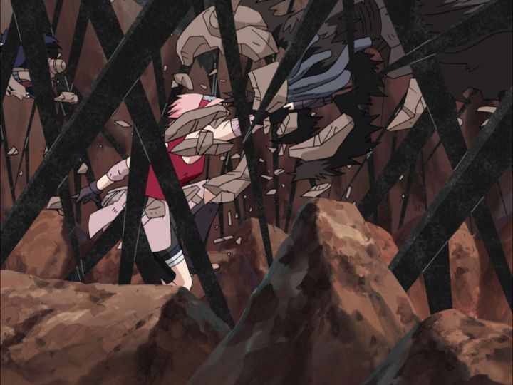 La jeune kunoichi combine ces dons de son mentor pour sculpter une ouverture, pulvérisant la troisième marionnette Kazekage de Sasori avec son poing !!