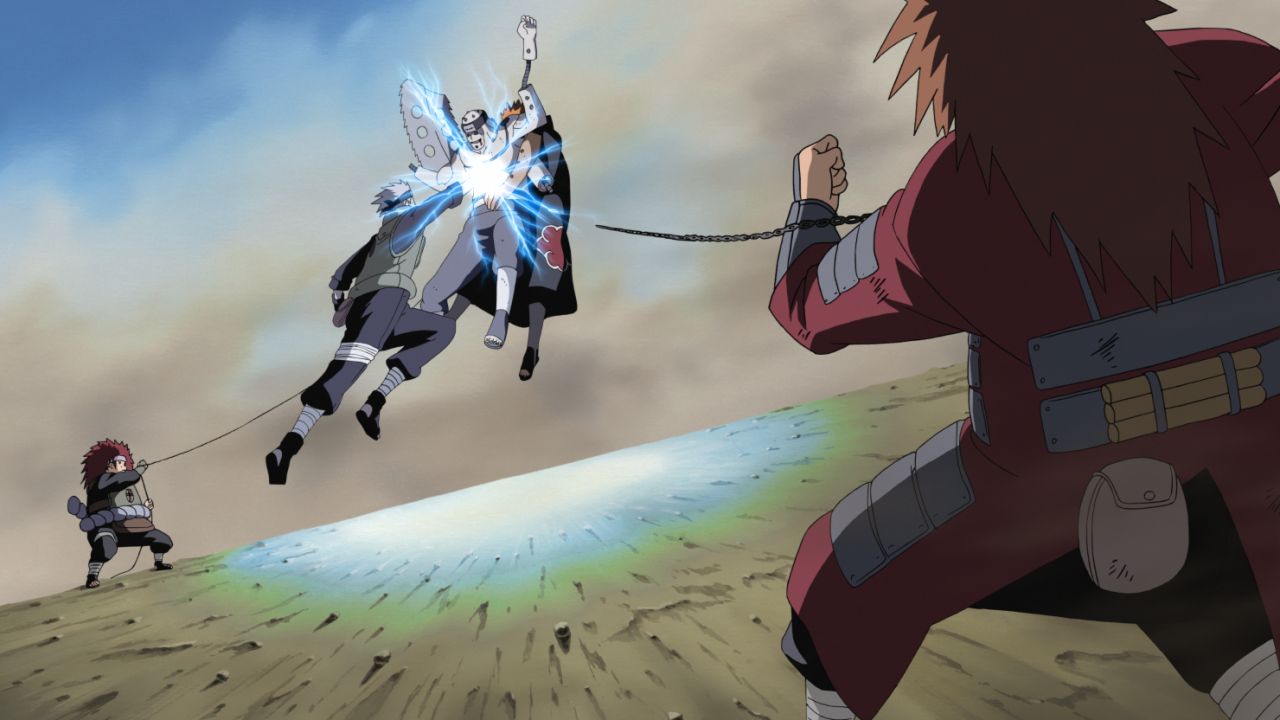 Kakashi prend deux des six chemins de la douleur, Tendo et Shurado, arrêtant l'incursion de l'avant-garde ennemie.