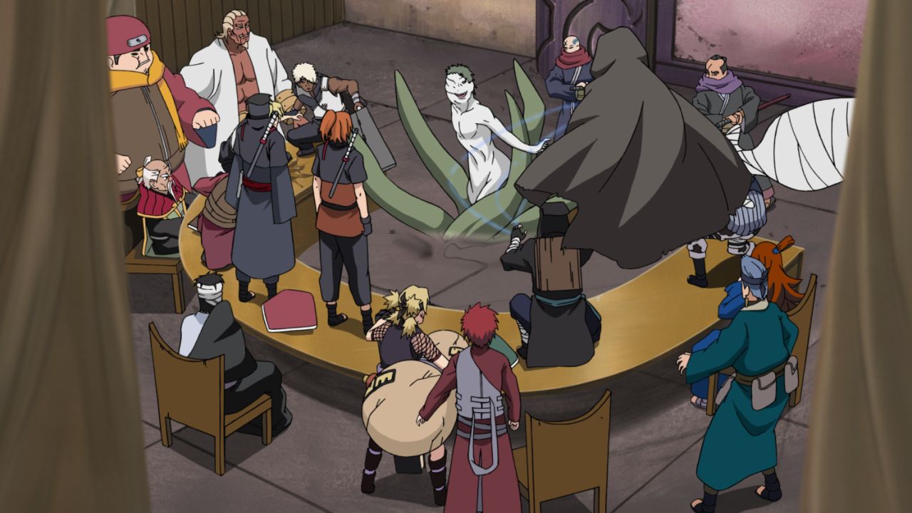 Les discussions concernant les Bêtes à queues, l'Akatsuki et la nécessité d'une alliance entre les villages shinobi sont déraillées lorsque Danzo est accusé d'utiliser le genjutsu pour manipuler la procédure. Au milieu du différend qui s'ensuit, le groupe Zetsu d'Akatsuki et le groupe de Sasuke, Taka, enfreignent les prémisses !!