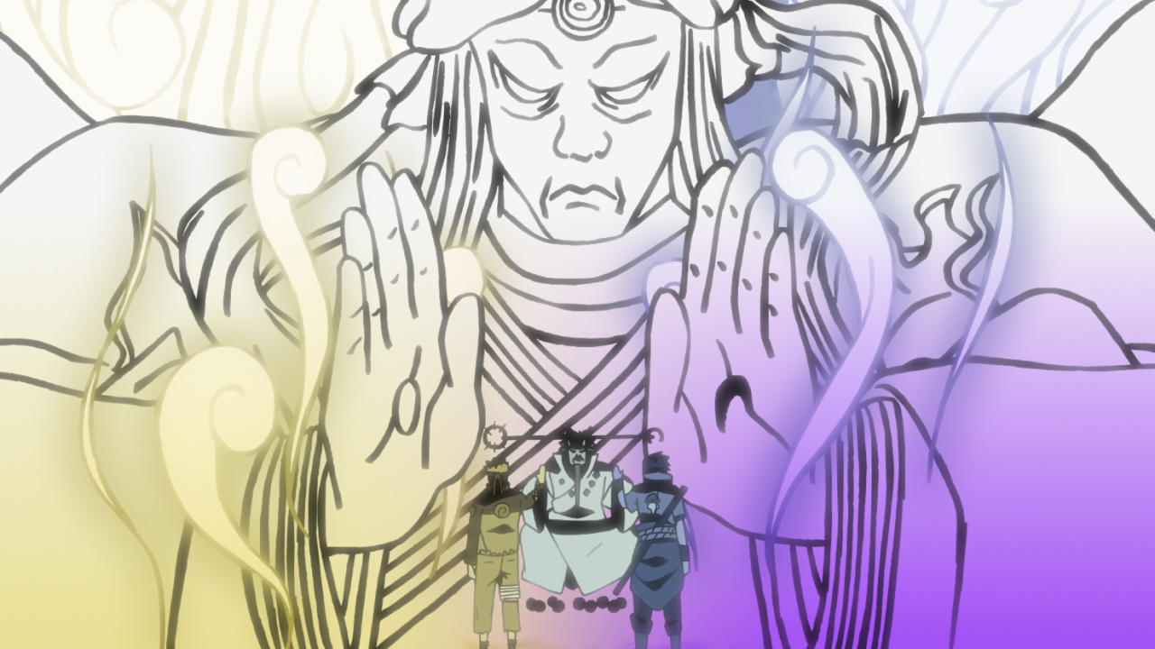 Après lui avoir raconté l'histoire de ce conflit entre frères et comment il a fait écho à travers le temps via des guerres sans fin entre shinobi, Hagoromo demande à Naruto ce qu'il cherche, ce qu'il espère obtenir au suite de la guerre.