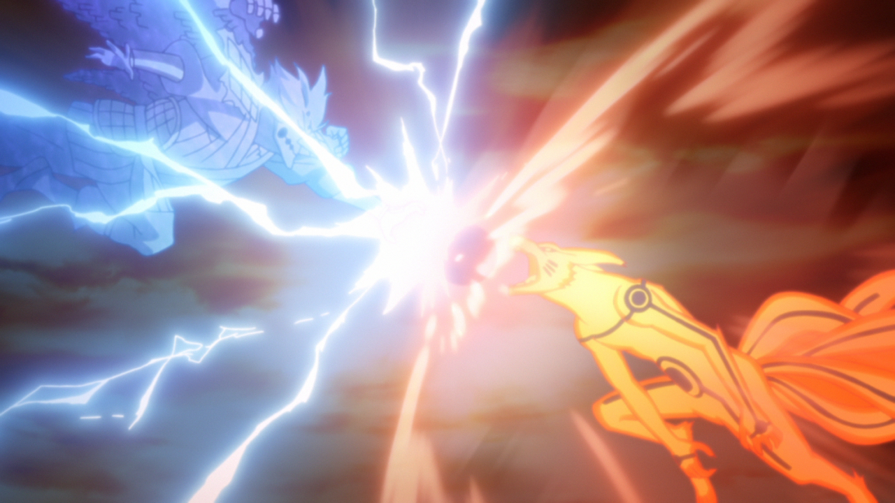 Essorant les dernières gouttes de leur chakra, les deux lancent leurs dernières attaques : Rasengan de Naruto et Chidori de Sasuke se rencontrent une dernière fois !!