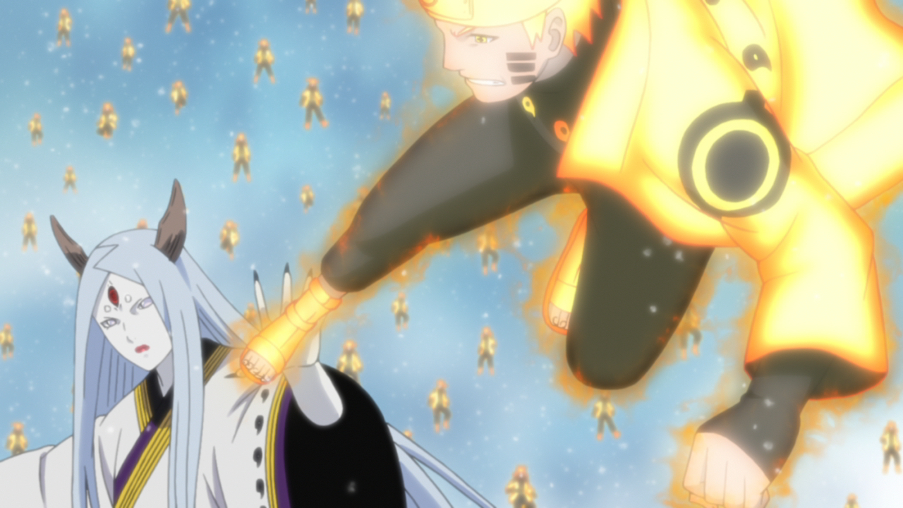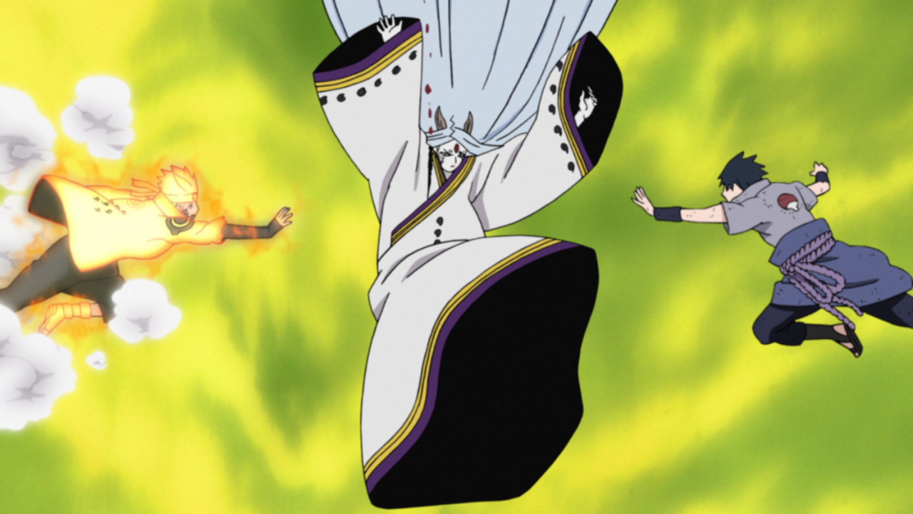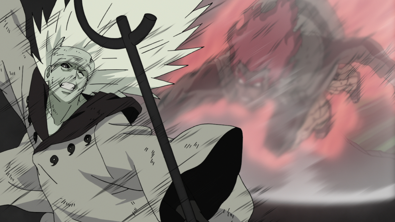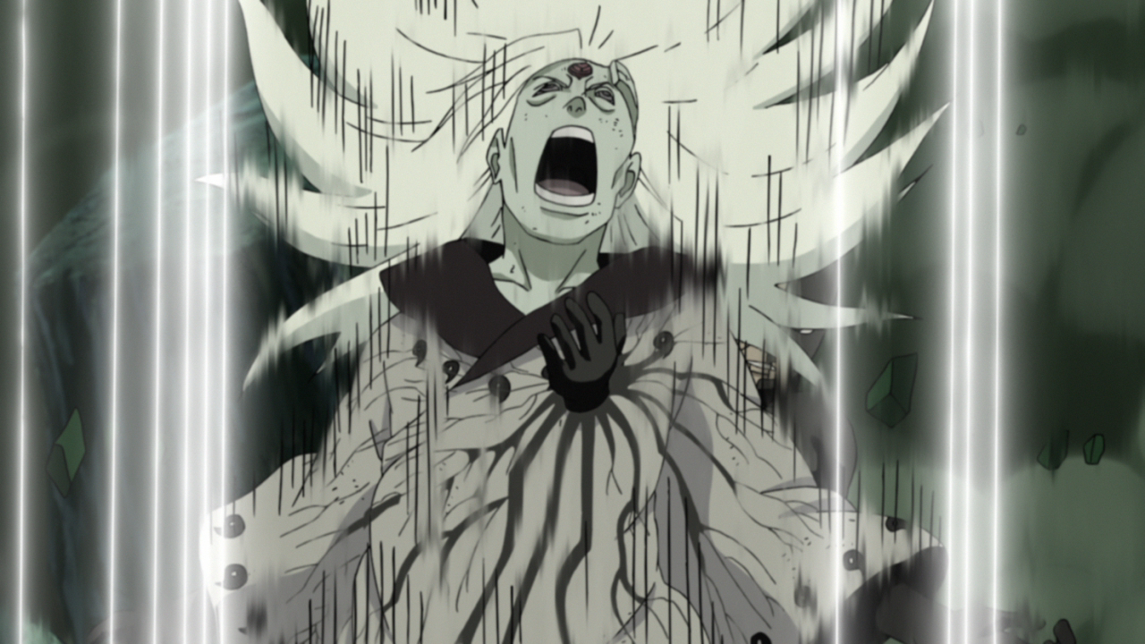 Gaara, Kakashi et Minato lancent une attaque désespérée pour empêcher Black Zetsu de transmettre la moitié de Minato de Kurama et le la gauche Rinnegan à Madara, mais le légendaire Uchiha les écarte, s'approchant de sa cible.