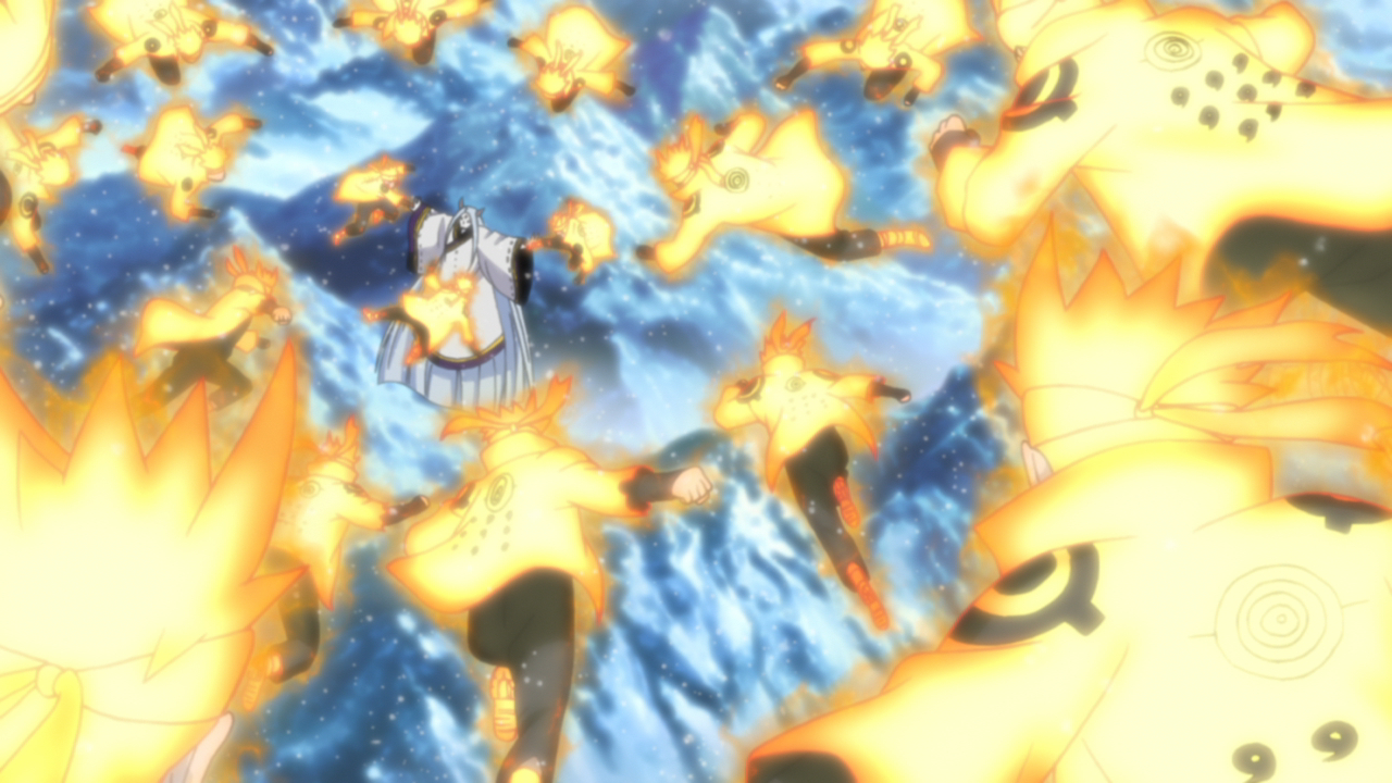 En retour, Naruto crée des clones d'ombre tout en maintenant sa transformation Kurama !!
