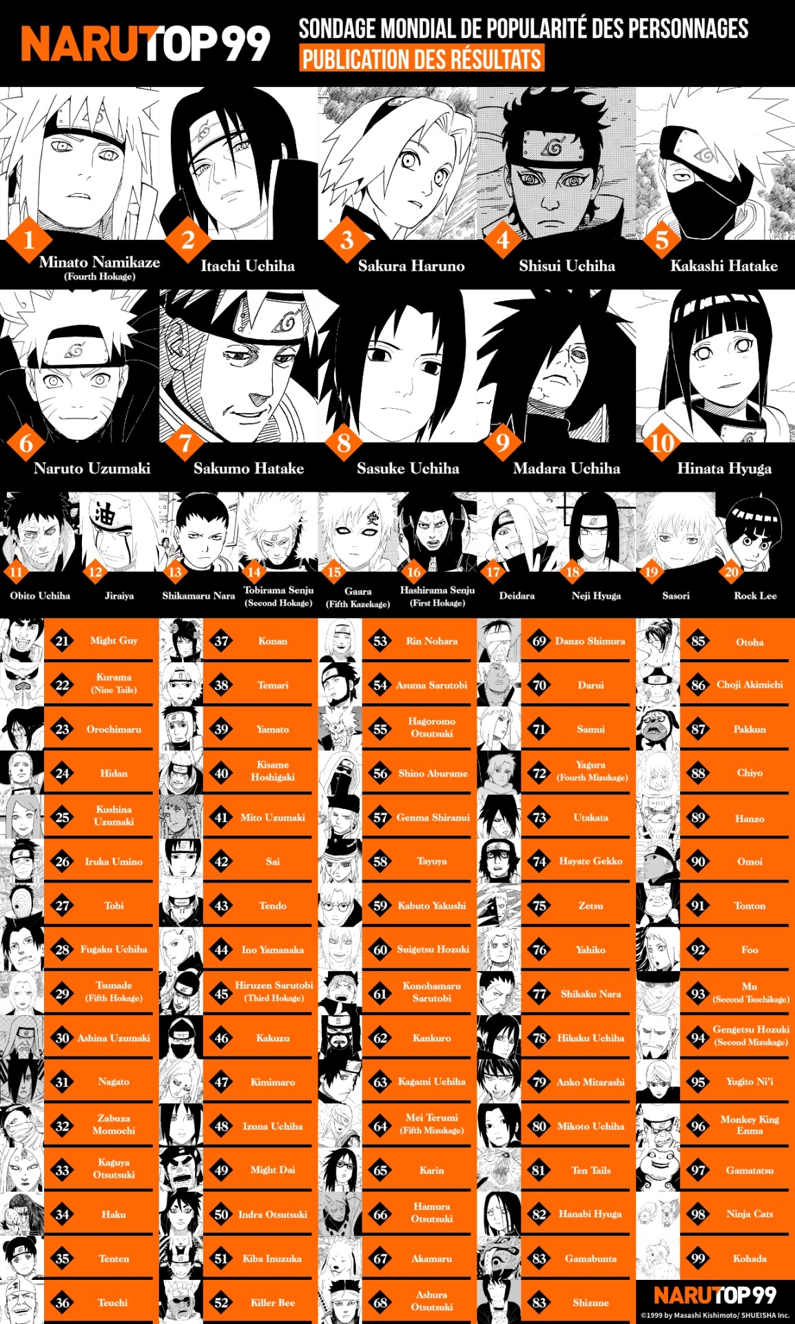 Les résultats finaux du vote de popularité de la 99ème à la 1ère place ont été annoncés dans la vidéo « [NARUTOP99] FINAL RESULTS | 最終投票結果ムービー » sur la chaîne YouTube « Jump Channel » !