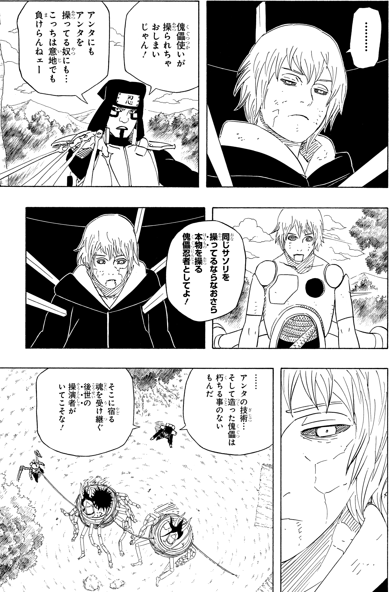 De Sasori à Kankurô, de Kankurô au suivant, et ainsi de suite... Il réalisa que la « beauté éternelle » à laquelle il aspirait serait achevée en la transmettant à la prochaine génération de ninjas. Avec fierté, il confia les marionnettes de « Papa » et « Maman » à Kankurôm, puis repartit.