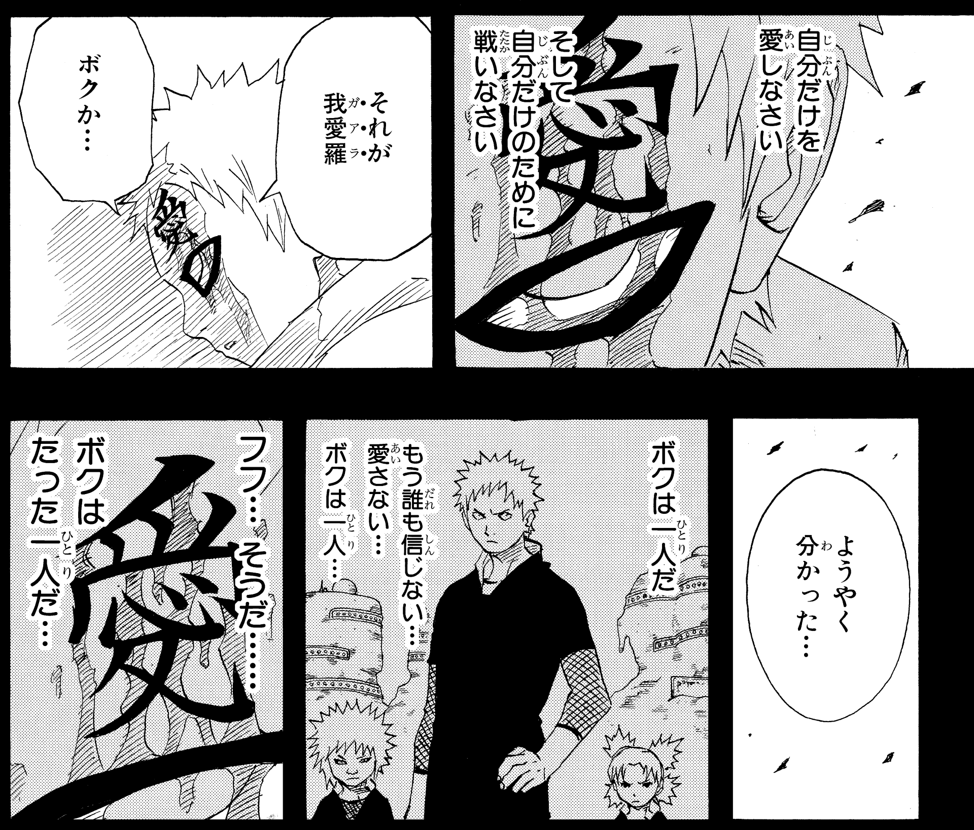 C'est ainsi que Gaara jura de n'aimer que lui, de se battre et de vivre seul uniquement pour lui-même.