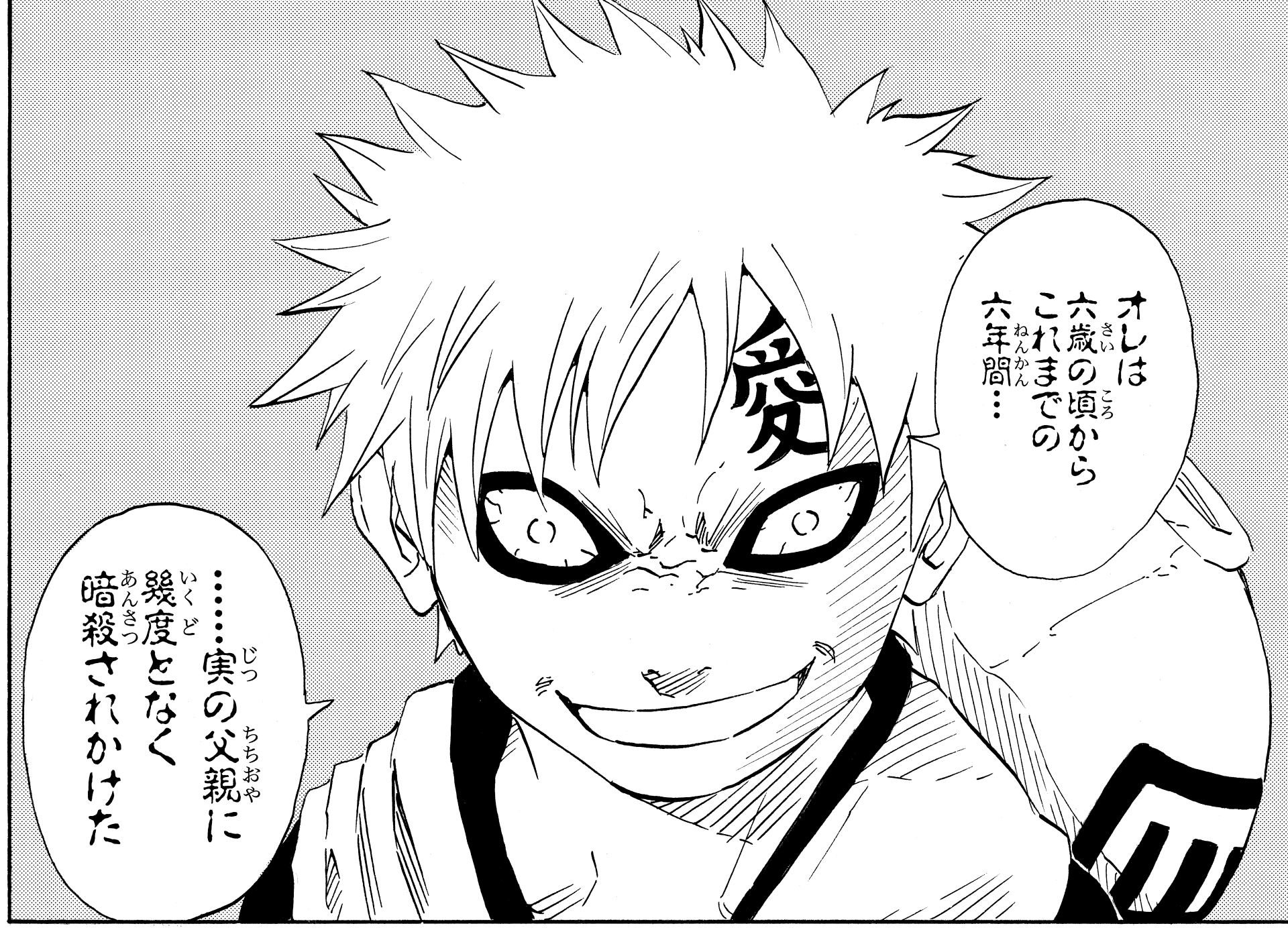 Depuis qu’il avait six ans et pendant six ans, Gaara, qui n’avait cessé d’être la cible de plusieurs tentatives d’assassinat de son père et qui avait failli être tué, prit conscience de la valeur de sa propre existence en tuant les assassins qui le poursuivaient.