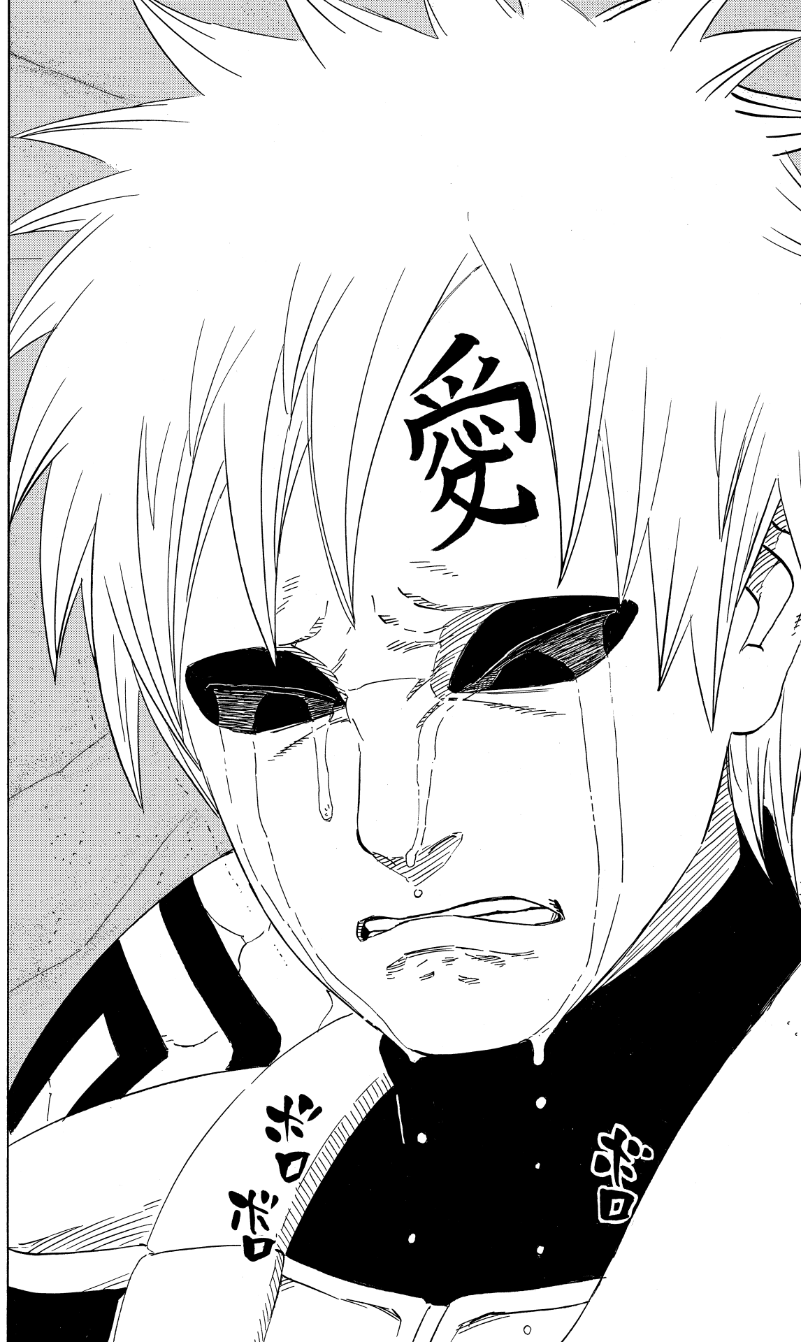 Alors que Gaara perdit le seul « amour » qui guérissait les blessures de son cœur, il désespéra et grava le mot « amour » sur son front.