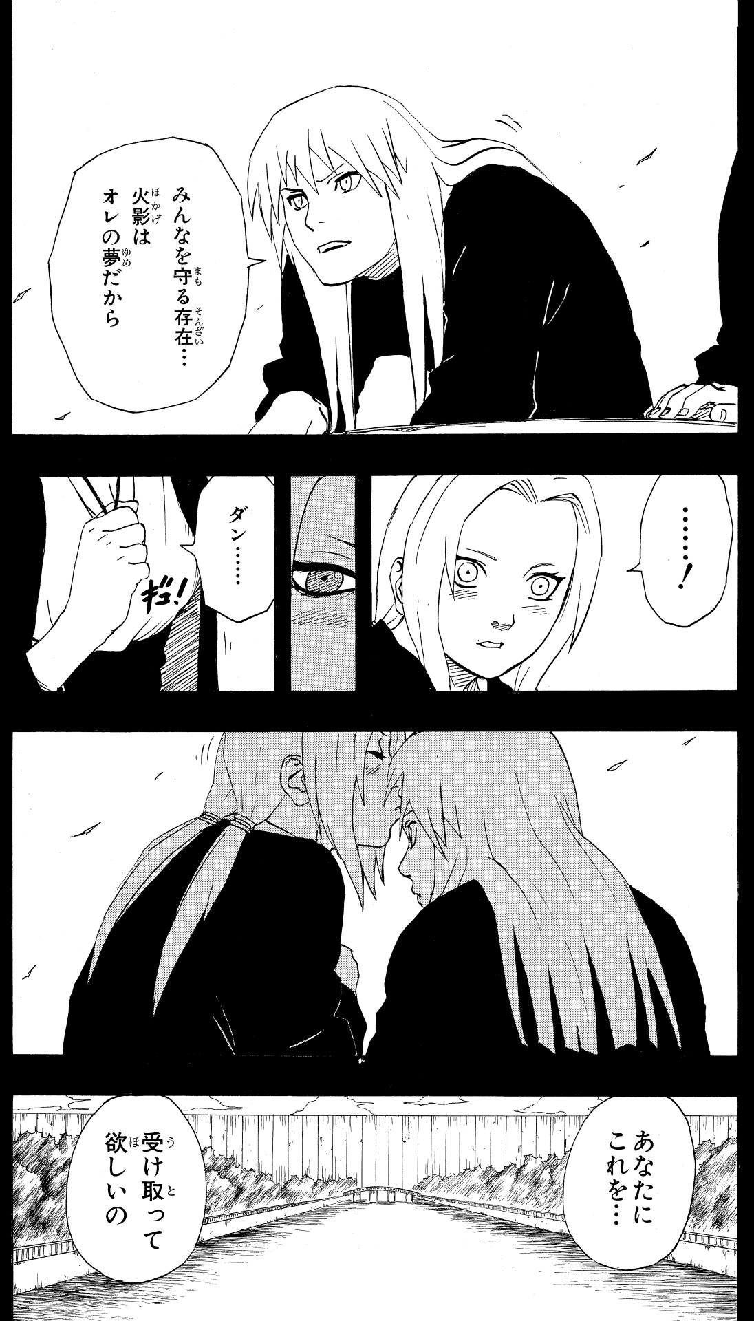 Dan accepta les sentiments de Tsunade et lui confia les siens en retour, elle qui avait hérité de son rêve et était devenue Hokage.